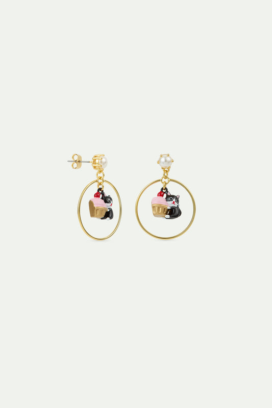 Ginger Cat And Blue Flower Dangle Hoop Earrings