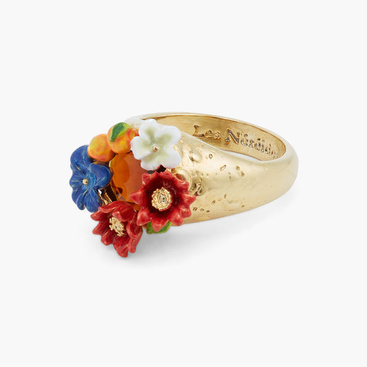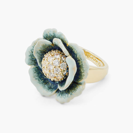Blue Flower And Round Faceted Crystal Adjustable Ring