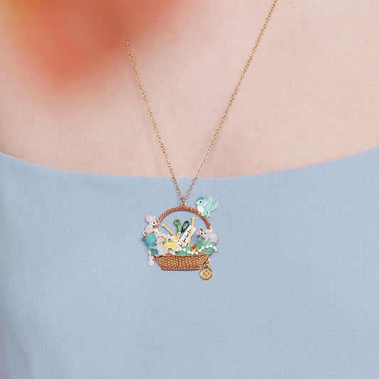 Mouse And Spool Of Thread, Scissors, Bird, Pearls, Measuring Tape, Needles And Wool Long Necklace