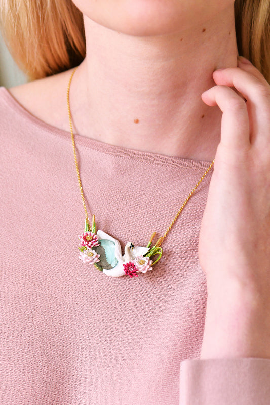 Flying Swan Among Water Lilies On A Blue Stone Collar Necklace