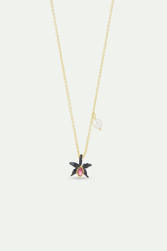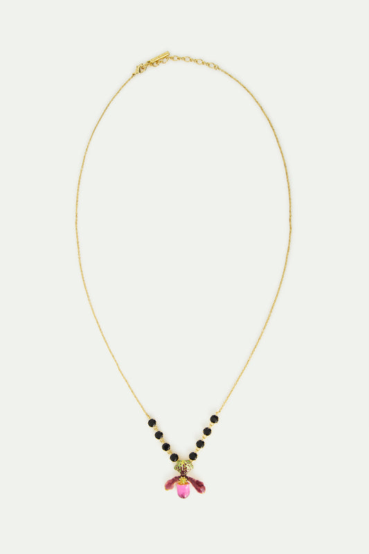 Purple Lady'S Slipper Orchid Black Crystal Stones Necklace