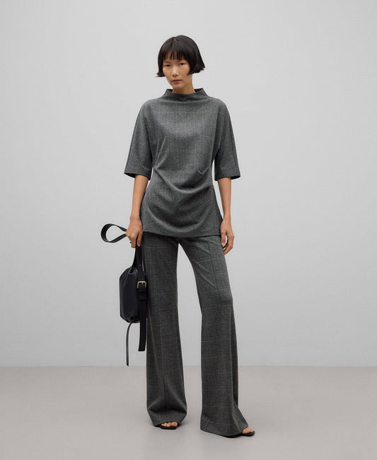 Beige/Black Print Crinkle Printed Top With Crew Neckline