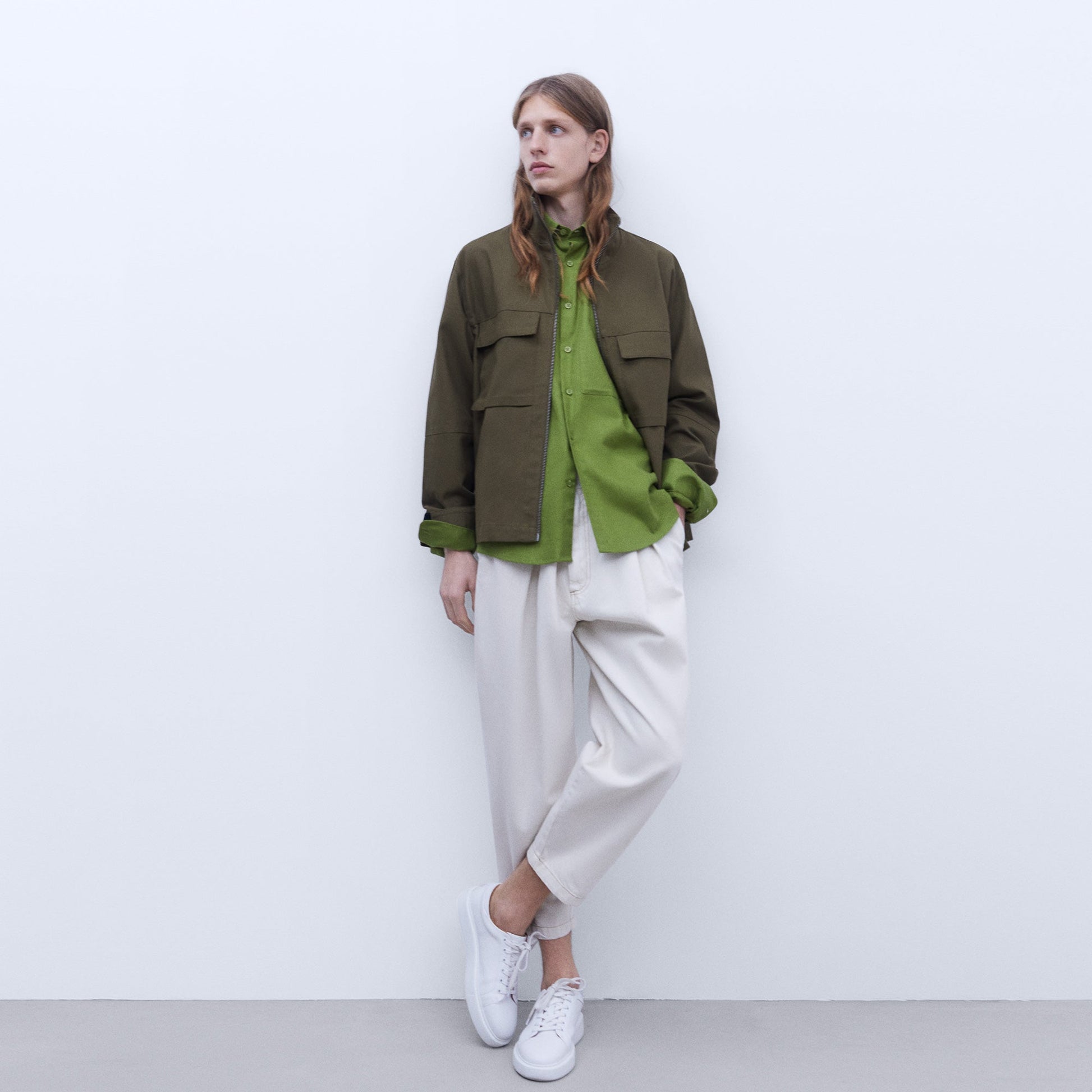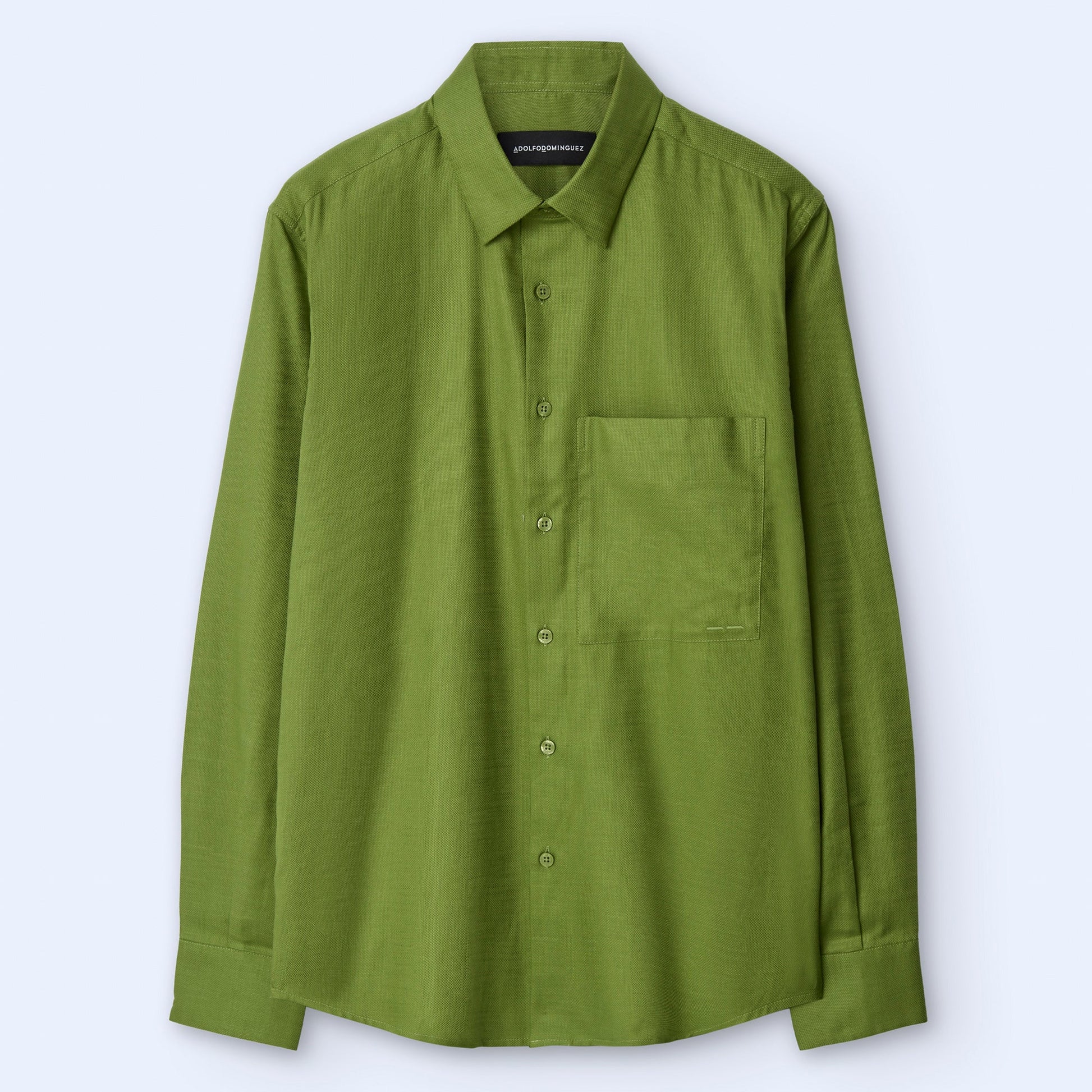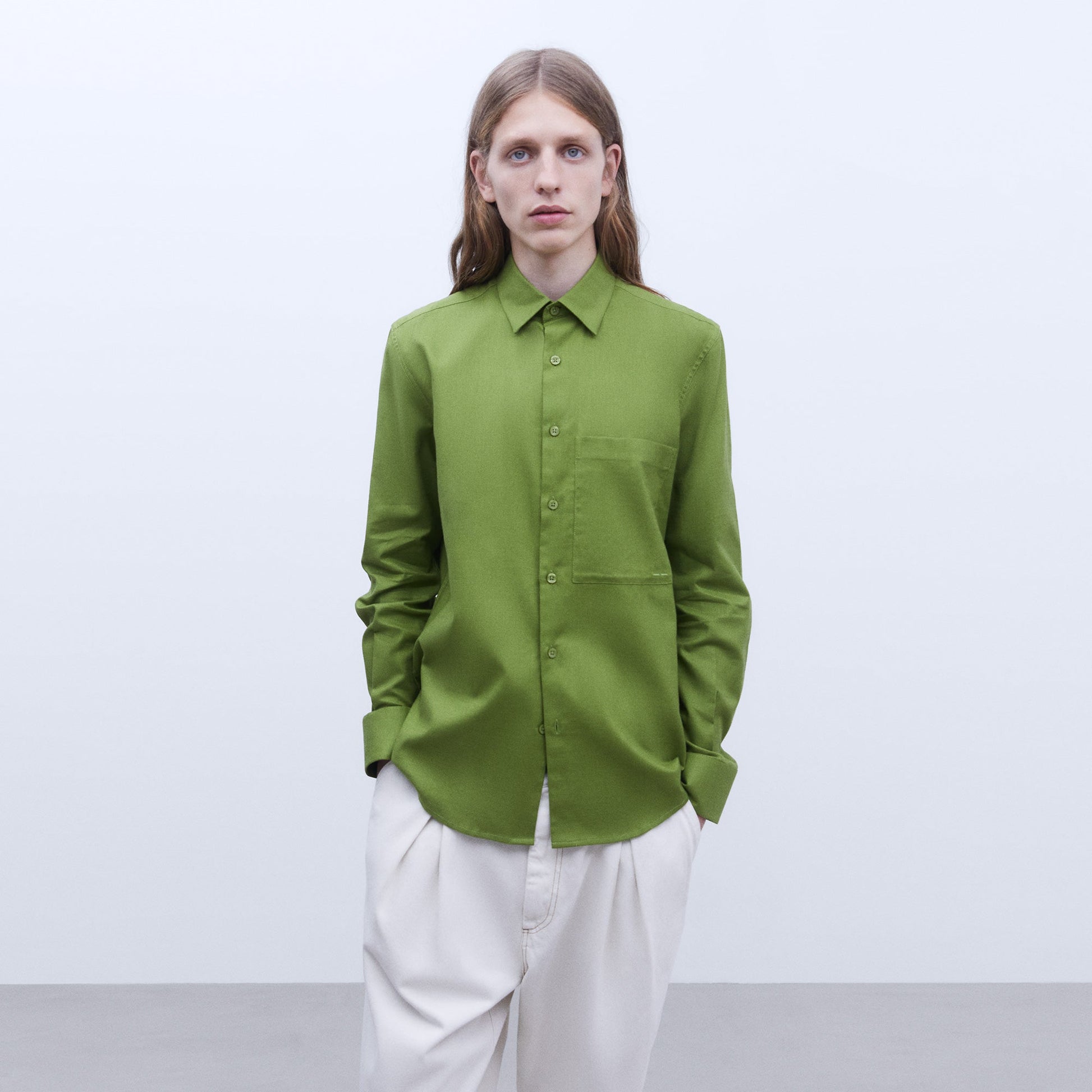 Cotton maxi-pocket shirt. Buttoned lapel collar. V-shape sardinettes. Maxi front plastron pocket with embroidered logo. Rounded hem. Regular fit.