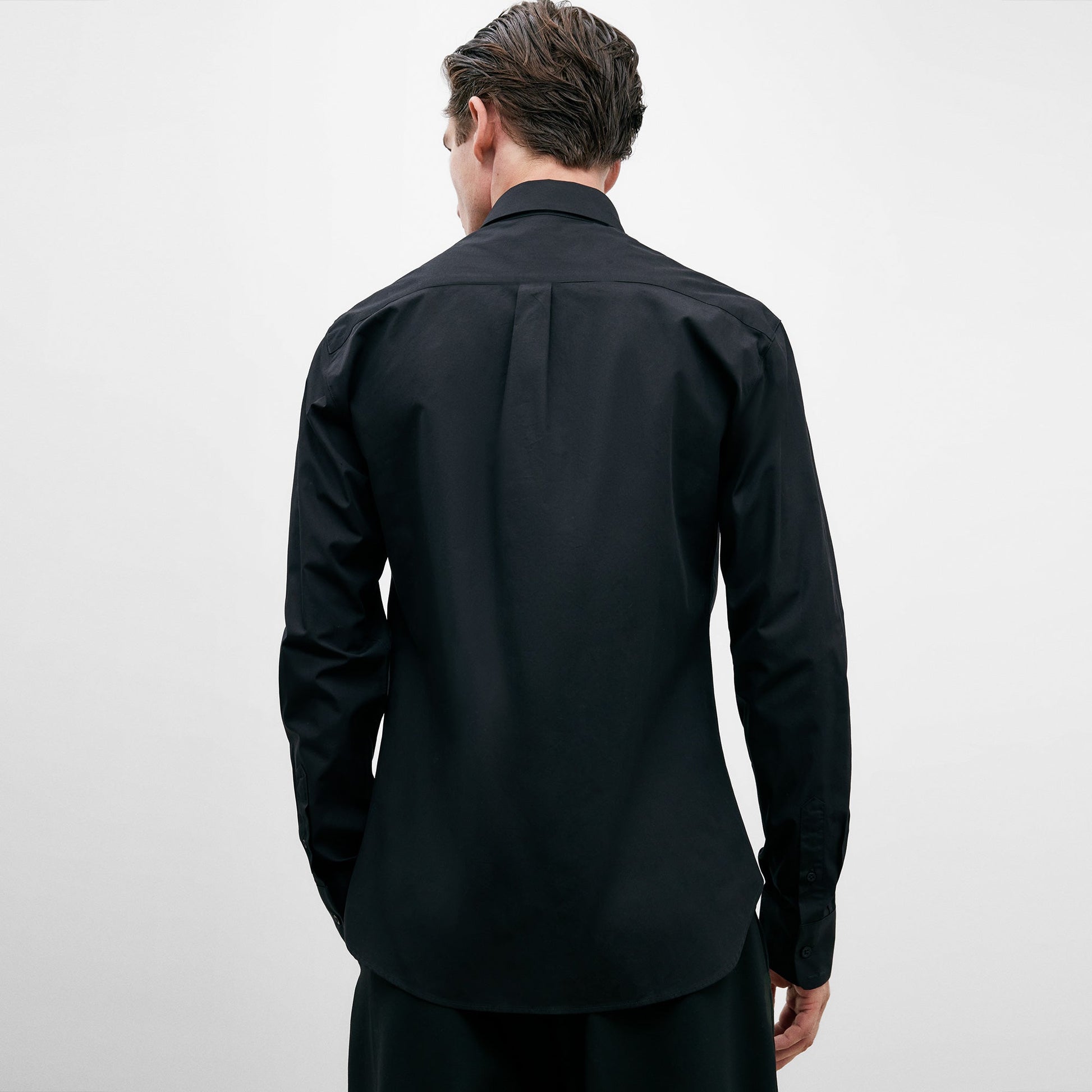 Introducing our exquisite Black Slim Fit Cotton Shirt from Adolfo Dominguez. This sophisticated black shirt features a classic shirt collar and a central set of buttons for a refined look. The buttoned cuff and long set-in sleeves add a touch of elegance to this timeless piece. Adorned with an embroidered logo on the cuff, this shirt is crafted from 100% cotton for ultimate comfort. Designed with a slim fit, it effortlessly enhances your silhouette, making it a must-have addition to your wardrobe.