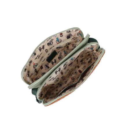 Your favourite crossbody is back! The Vendula Pie Shop Bella Bag features two zipped compartments, an adjustable strap, and a mouth-watering pie shop design. Crafted from vegan leather, it displays delicious printed and appliqué details like fabric blinds, tiled walls, and scrumptious pies. Whether you're running errands or enjoying an autumn stroll, this cheerful accessory is guaranteed to brighten your day—and your outfit.