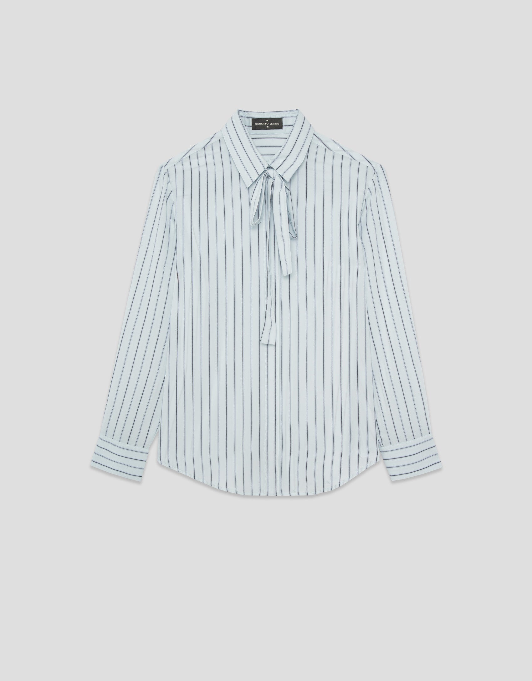 Long-sleeved shirt in a white base fabric with blue stripes. It features a shirt collar with a bow, buttoned cuffs, and a concealed button placket.
