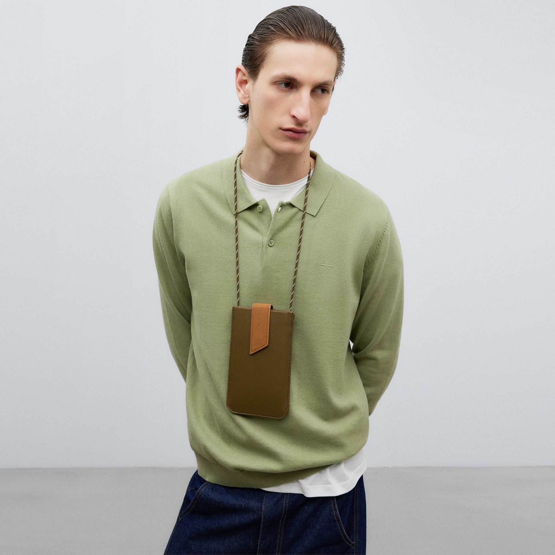 Recycled Cotton Mobile Phone Holder. One Compartment. Clasp Strap Closure. Engraved Logo. Strip Hanger. Recycled Polyester Lining.