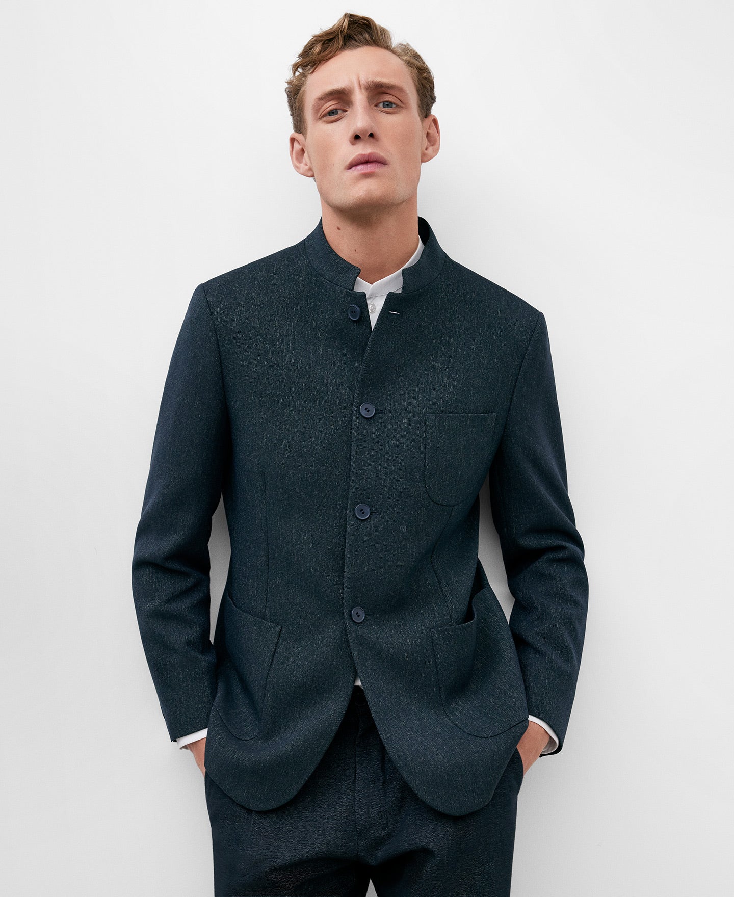 Description: Introducing our exquisite Blue/Grey Mandarin Collar Blazer for men from Adolfo Dominguez. This sophisticated blazer features a sleek grey color and a stylish mandarin collar. With its button fastening, plastron pockets, and double back slit, this blazer exudes elegance and refinement. Additionally, it is thoughtfully designed with inner pockets for your convenience. Elevate your wardrobe with this luxurious piece that effortlessly combines style and functionality.