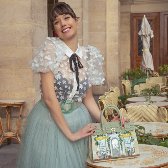The La Petite Crêperie Everly Bag is simply magnifique! Ideal for everyday use, it has a roomy compartment and multiple pockets to accommodate everything you need. It comes with a handle and a detachable strap for all-day comfort. Crafted from vegan leather, it features a soft, feminine colour palette and detailed artwork of a Parisian crêperie, complete with a delicious window display and an idyllic terrace where a fluffy pup prepares tasty treats. Treat yourself—you deserve it!