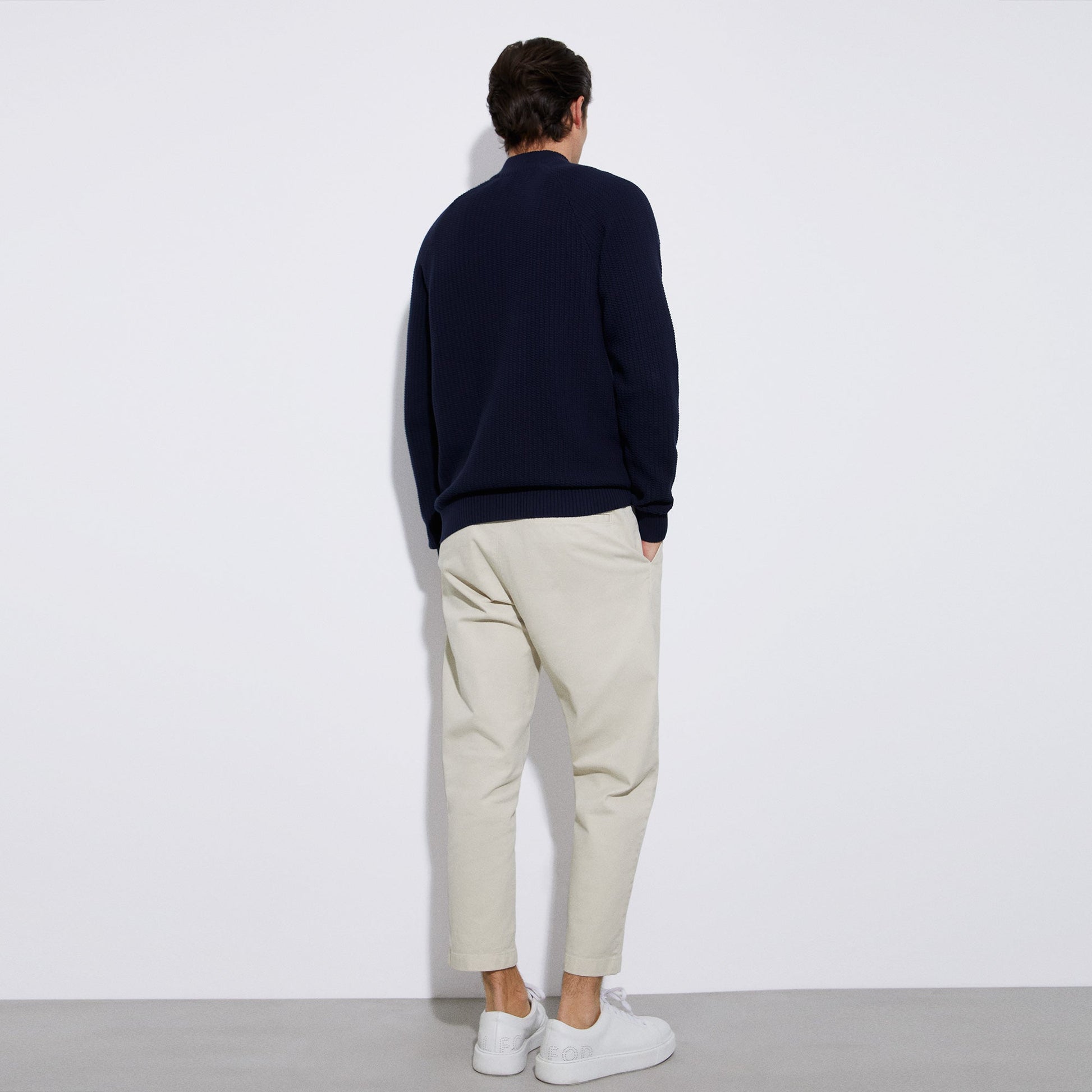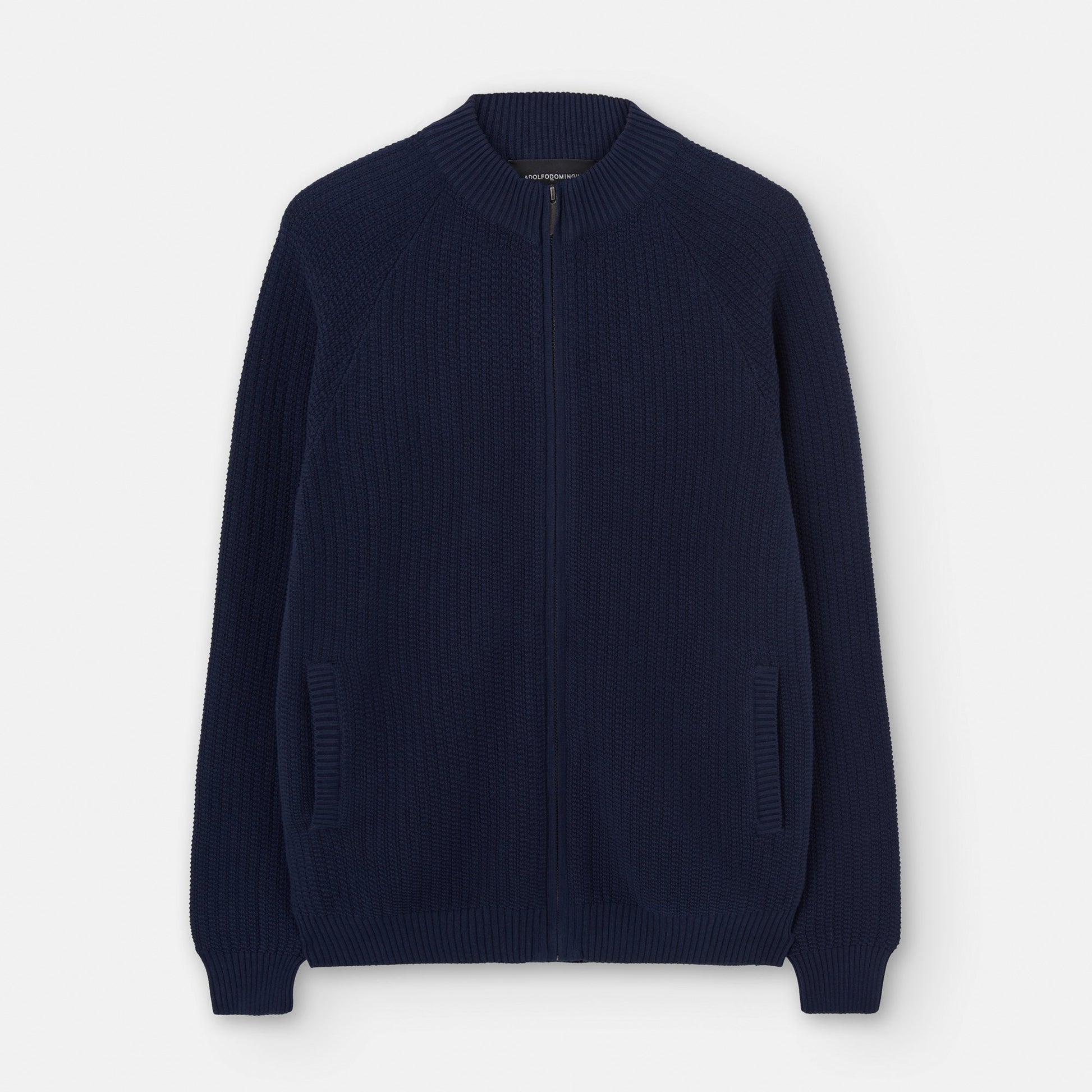 Central zip crew neck jacket in responsible cotton jersey. It has raglan sleeves, piped side pockets and ribbed trims.100% Responsible Cotton Rangled Sleeves Boxed Collar