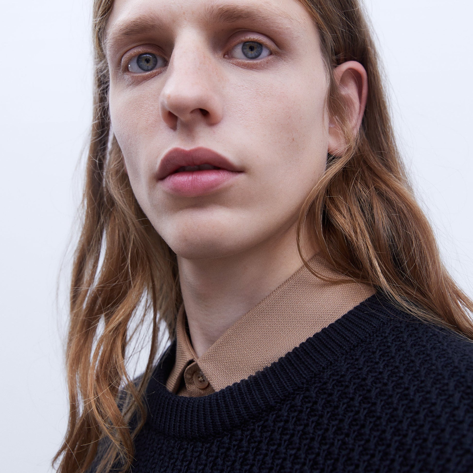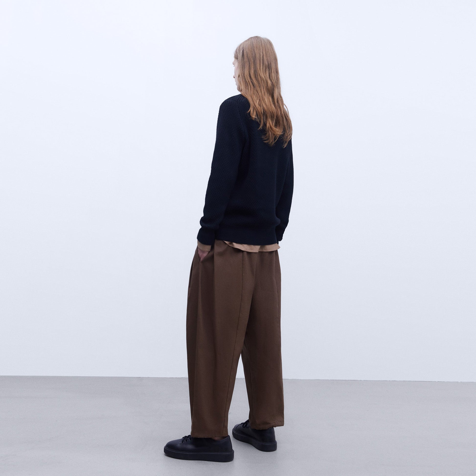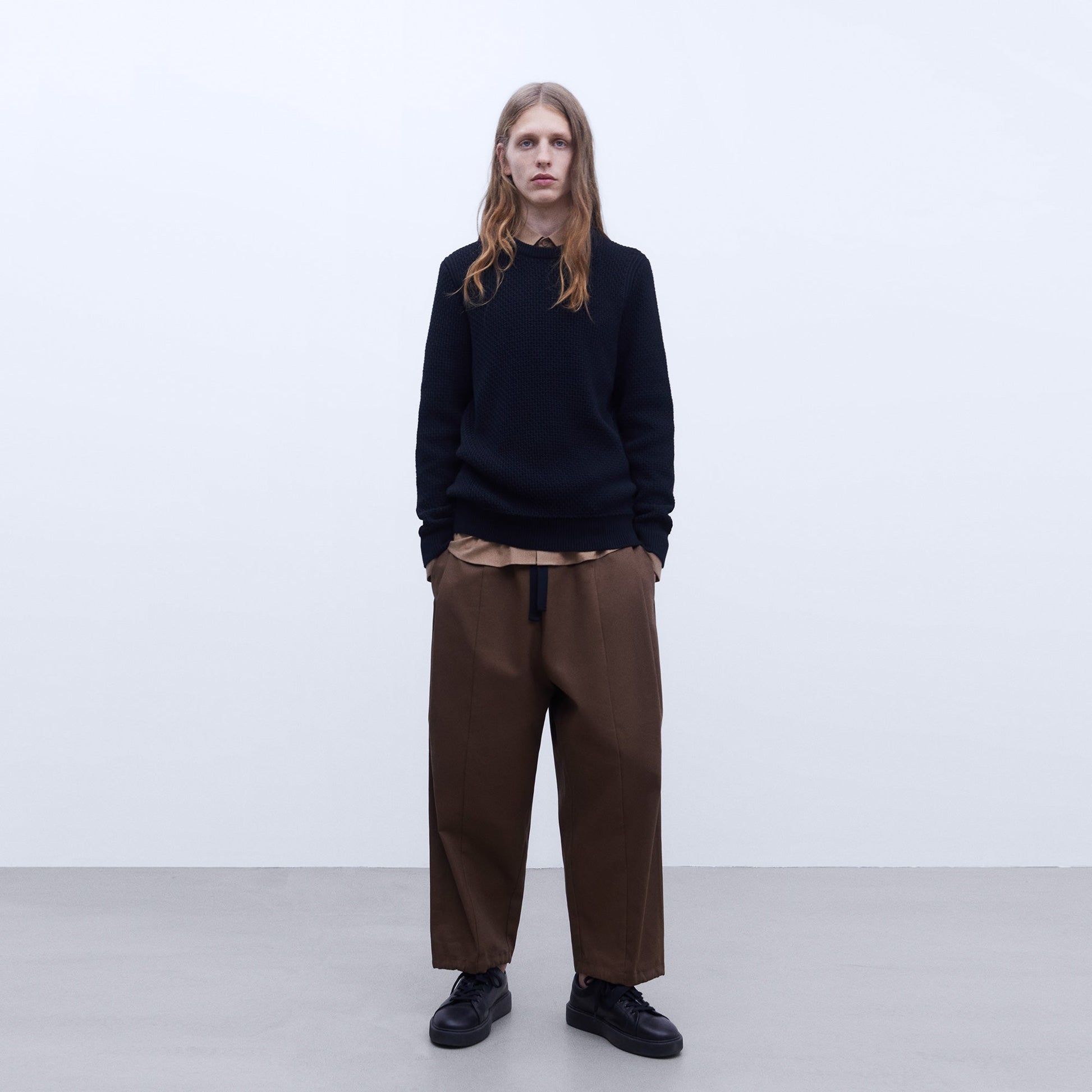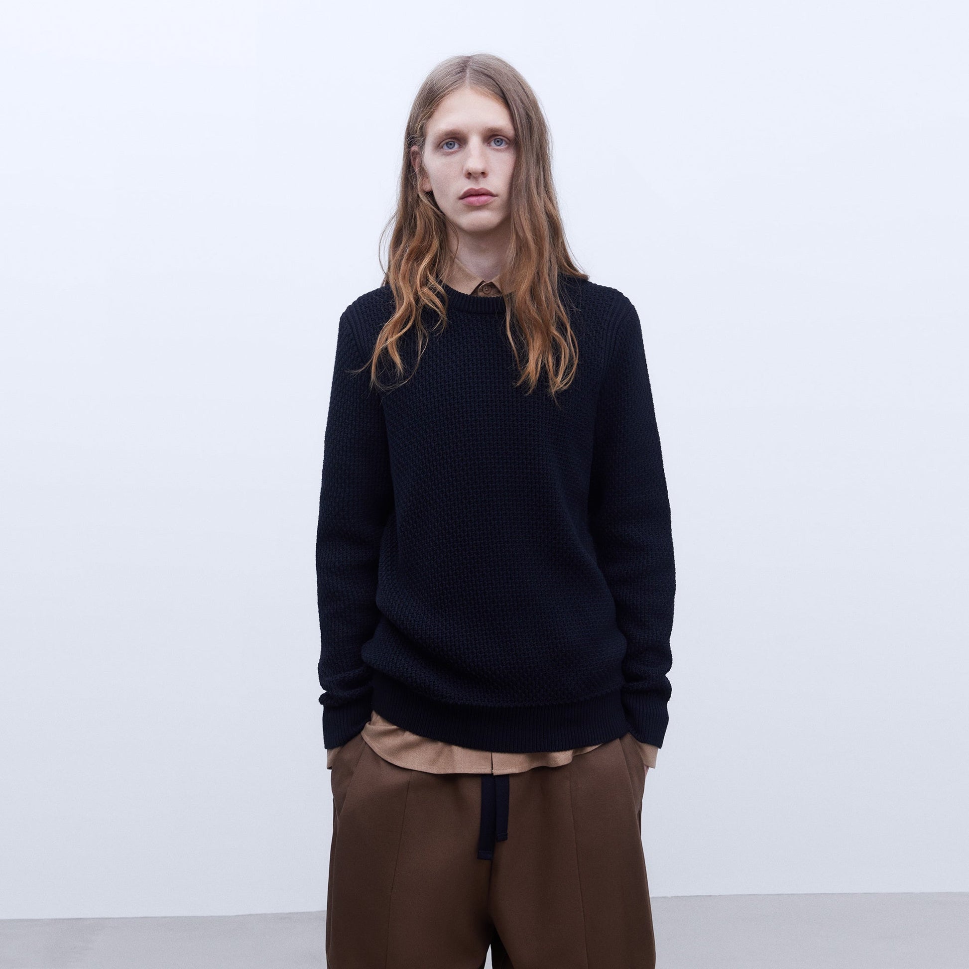 Cotton structured crew neck sweater. Shifted seams. Decreased details. Ribbed trims.