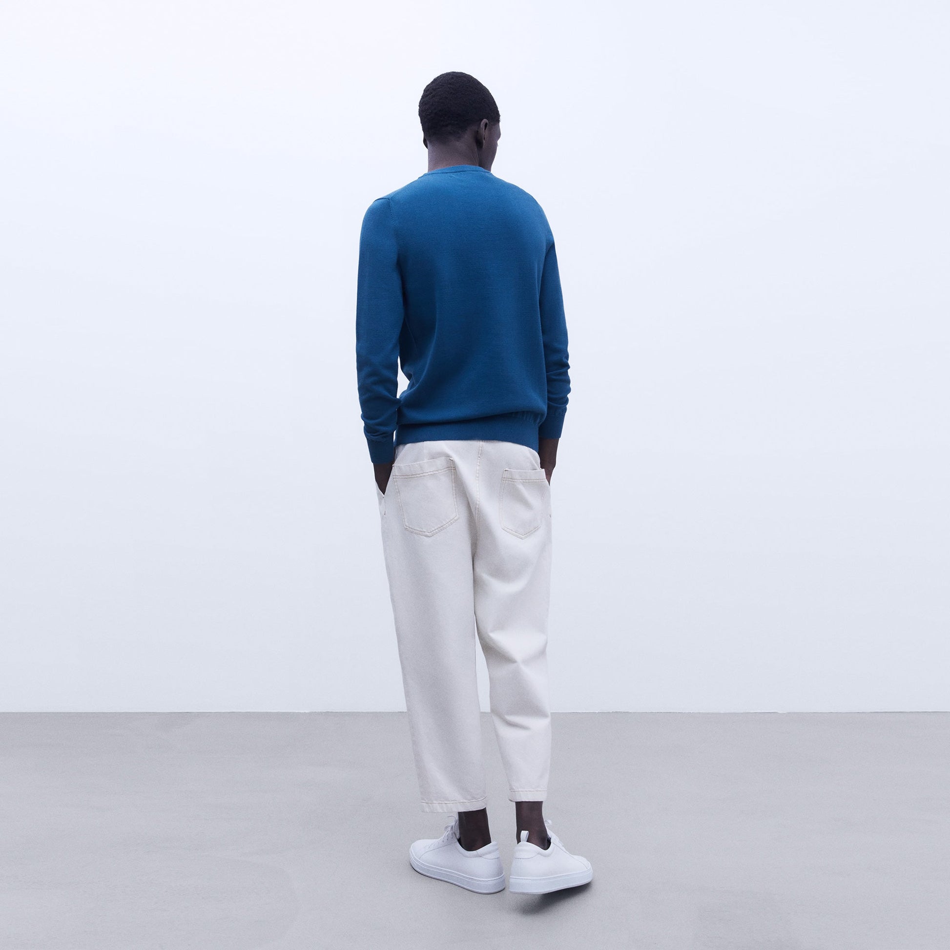 Ribbing on collar, cuffs and hem. Tailoring on shoulder seams.
