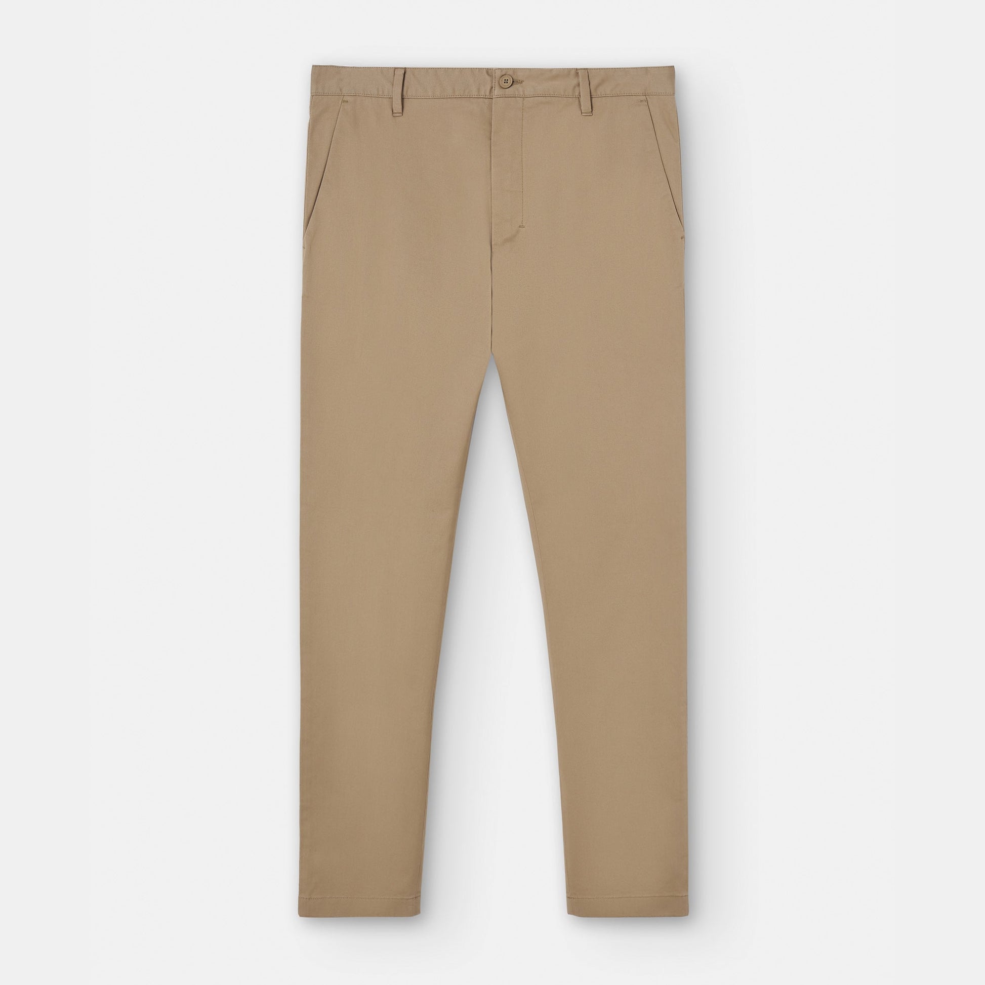 Carrot silhouette chino pants in responsible cotton. It has front pockets and back welt pockets. Front zipper and button closure.Responsible Cotton Carrot Silhouette Side Pockets Zipper Closure