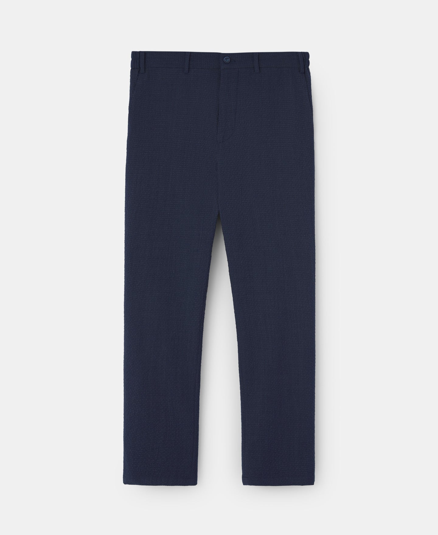 We need basics. Like these navy blue straight trousers. With button detail, high rise and straight cut. It has almost invisible organic pockets and elastane in the waistband for extra comfort. Wear it with a shirt or a cotton T-shirt.High Rise