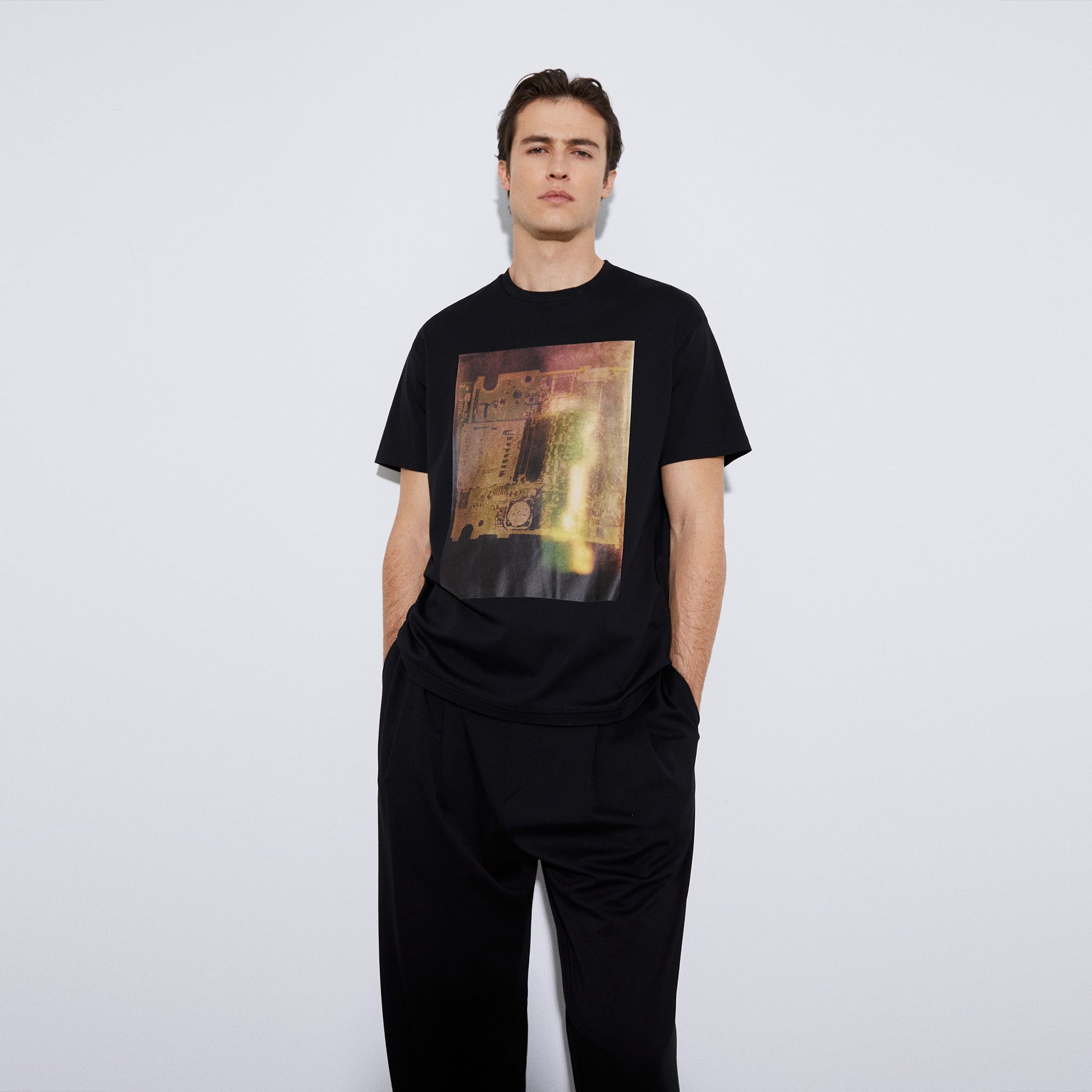 Oversize cut T-shirt in cotton and polyester with a signature print on the chest. It has a round neck, short sleeves and straight hem. Made in Portugal.cotton