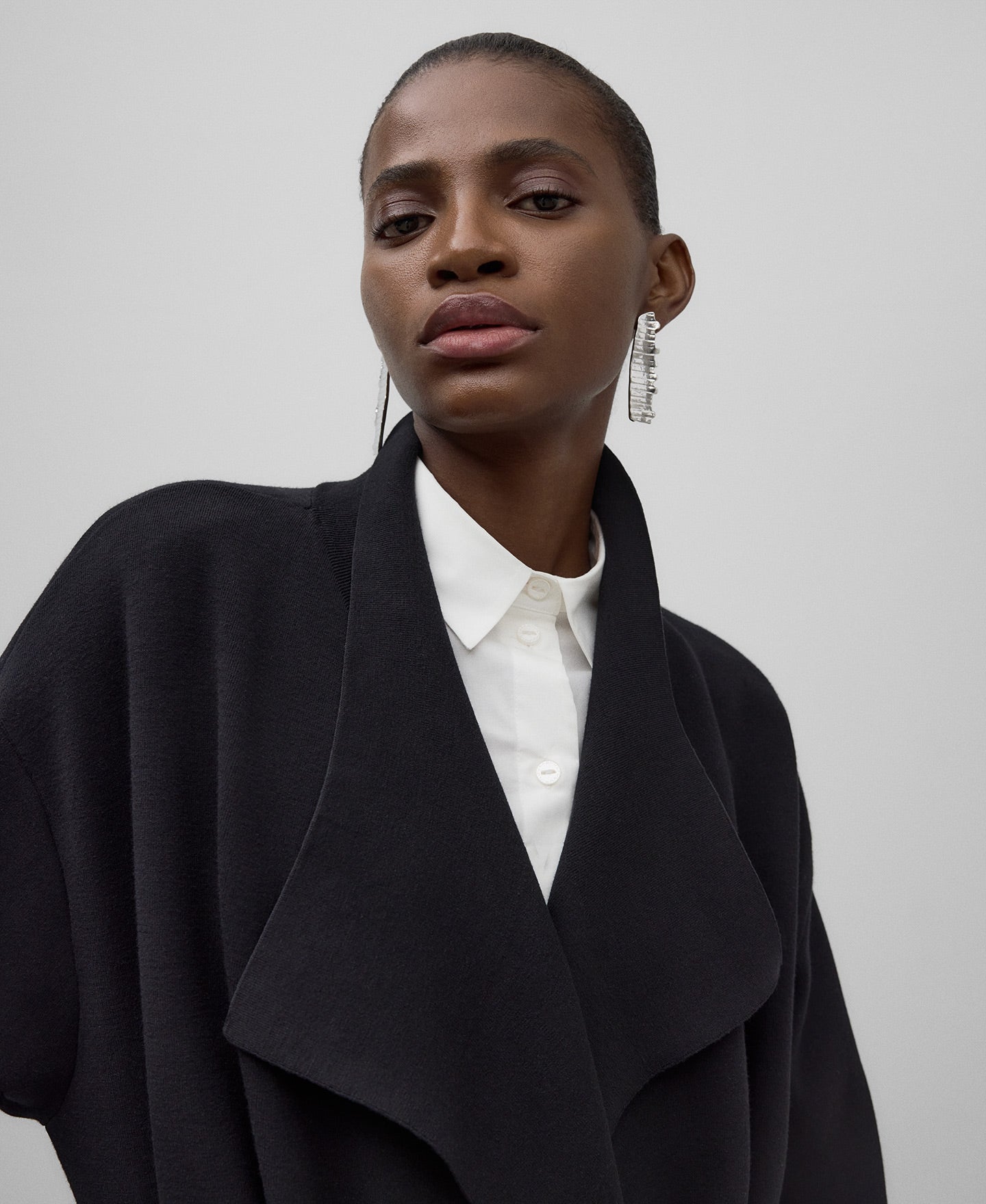 Responsible viscose double-knit coat woman. Long sleeve. Wrap collar. Pockets on the side. Cord belt.