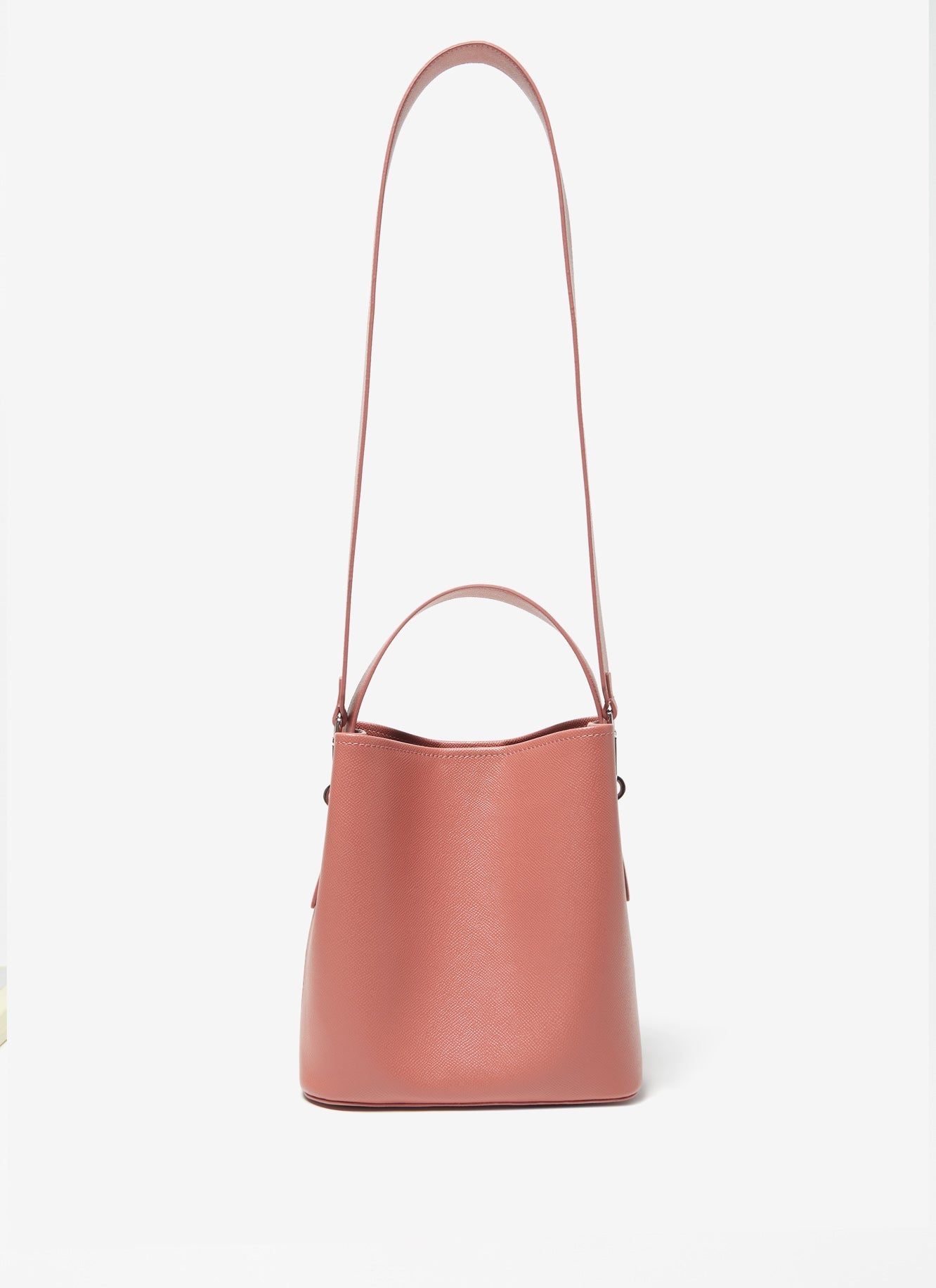 Our vegan saffiano bags are almost indestructible. They are durable and enduring. The mini version of our bucket bag features a single compartment with double clasp closure and two carrying options: a short handle and a crossbody strap.