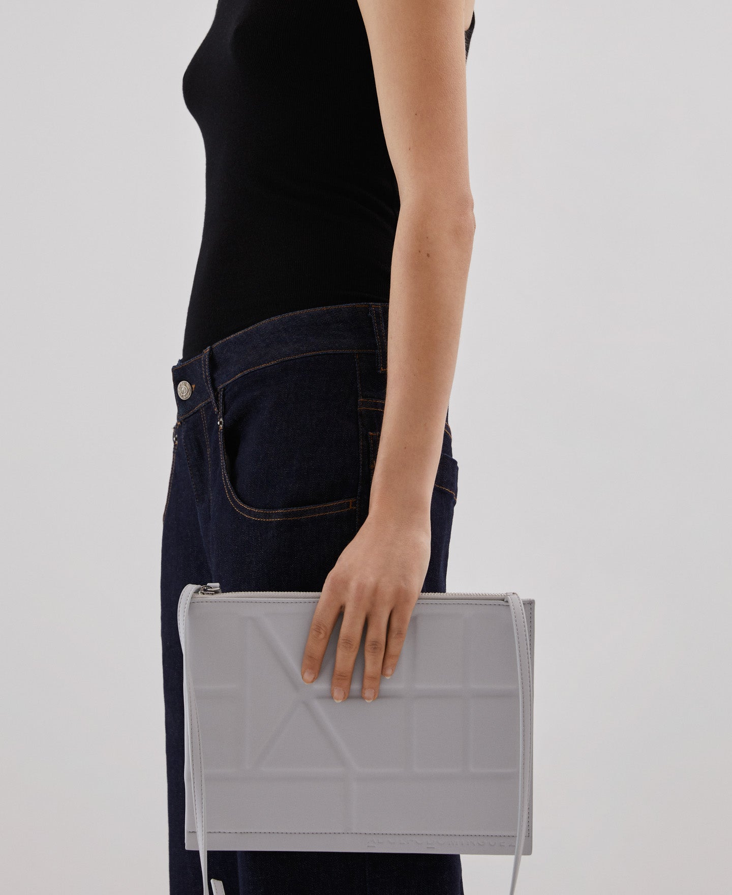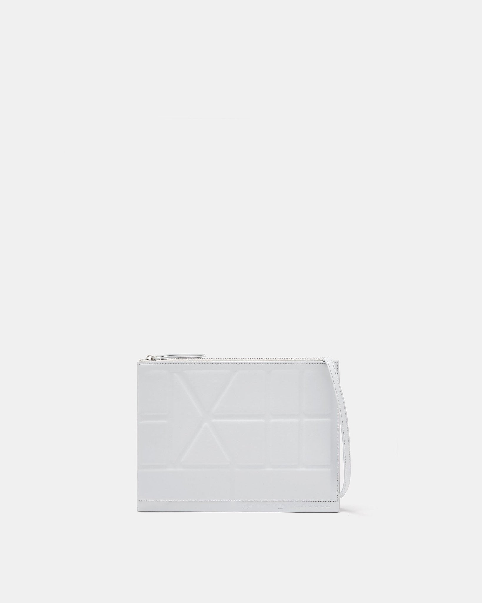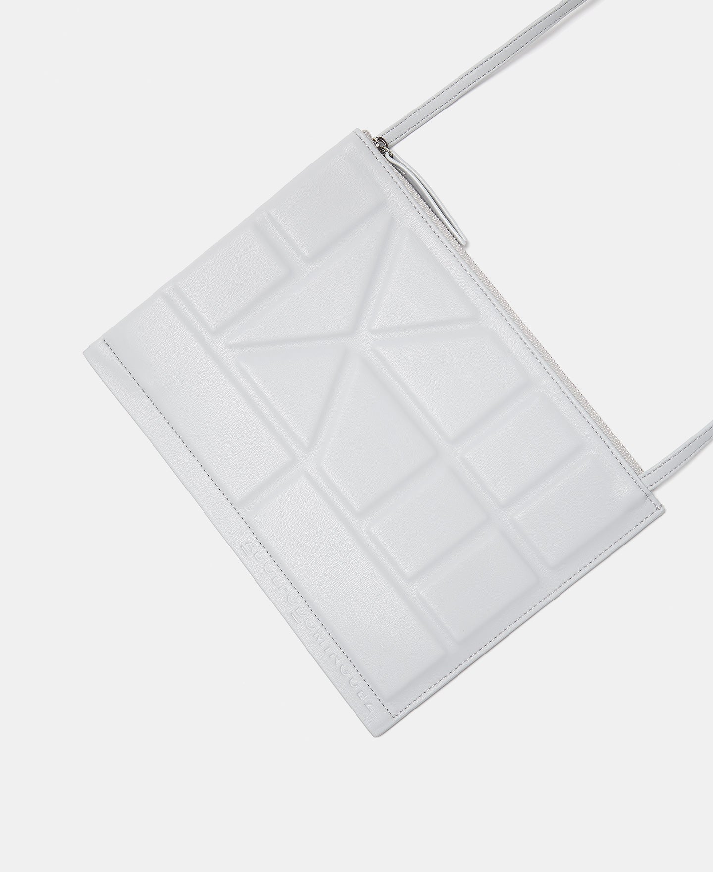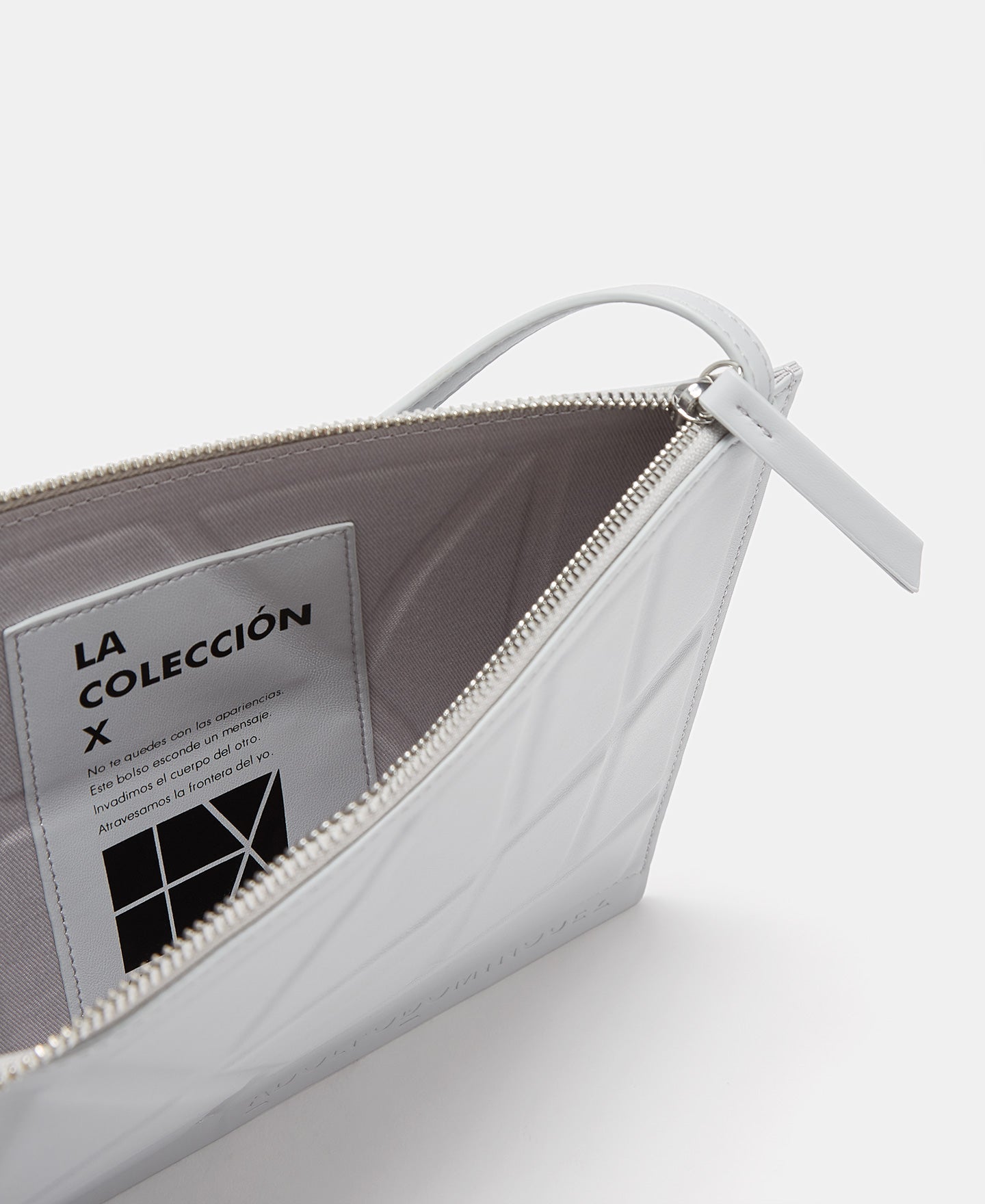 Geometry on your shoulder. A flat crossbody bag, like a polyurethane paper sheet on which we have drawn converging lines. Soft shapes contrasting with the vibrant inner colour. Because the private side is so exciting.