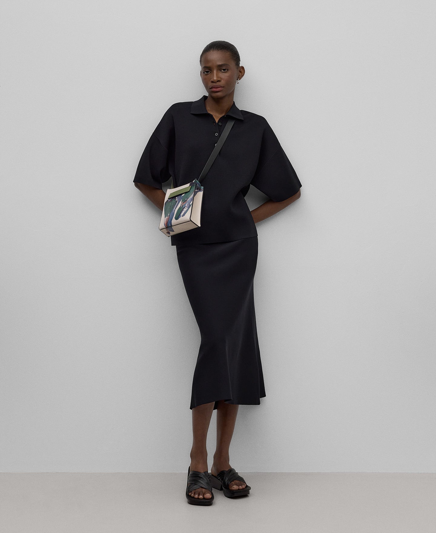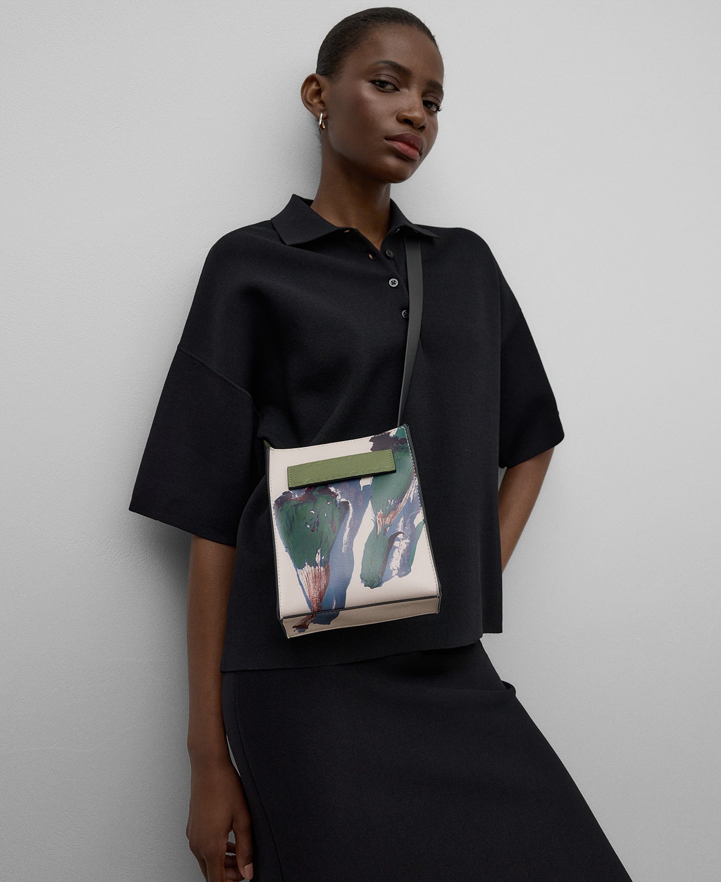 Small rectangular crossbody woman. Pattern on the front and one side. One compartment. Fixed long strap. Exterior label with logo.