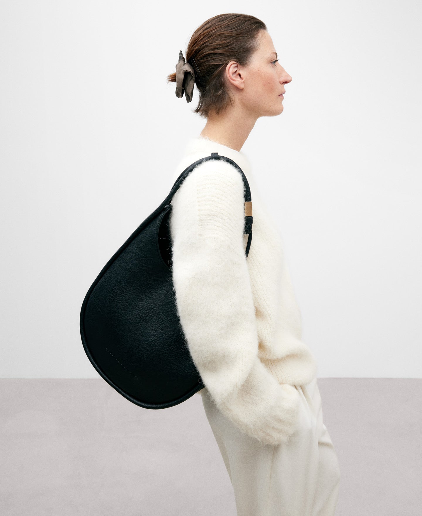 Indulge in the perfect blend of fashion and eco-consciousness with our Black Recycled Material Hobo Bag. Elevate your style while making a positive impact on the environment. Experience luxury redefined with Adolfo Dominguez.
