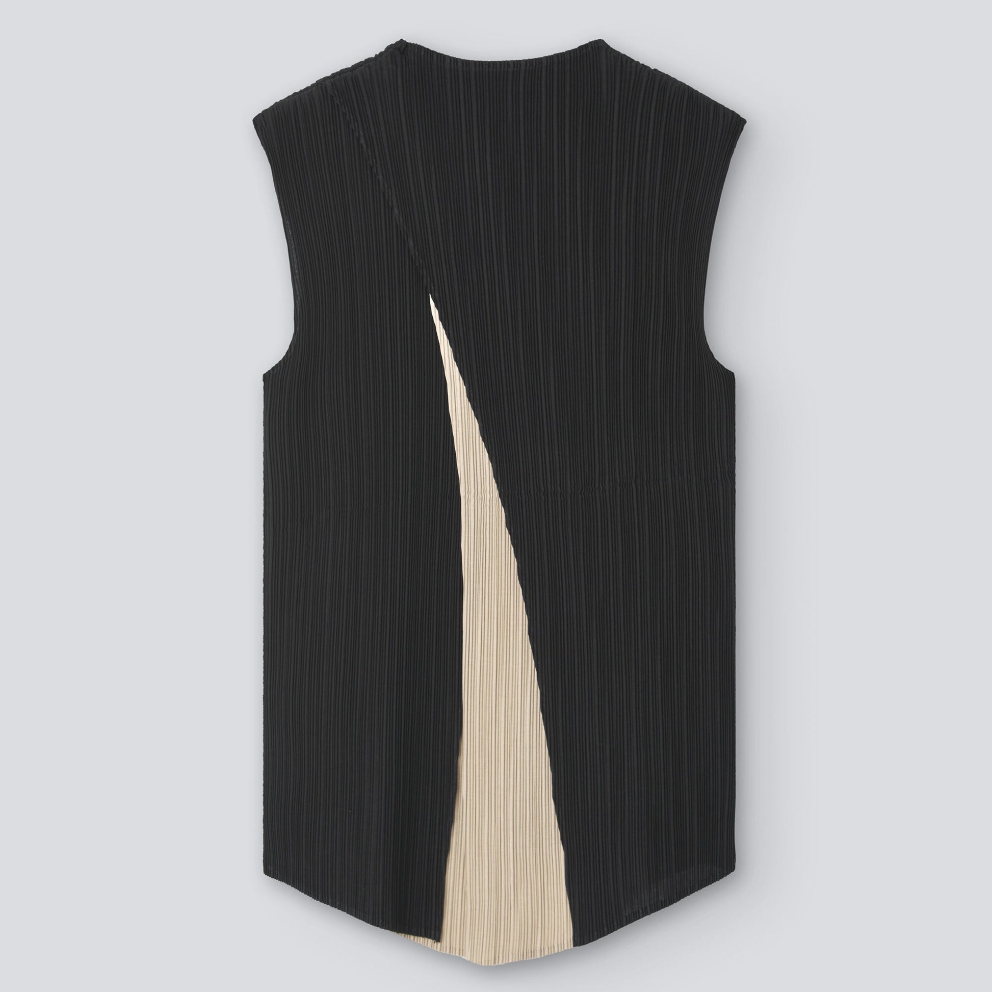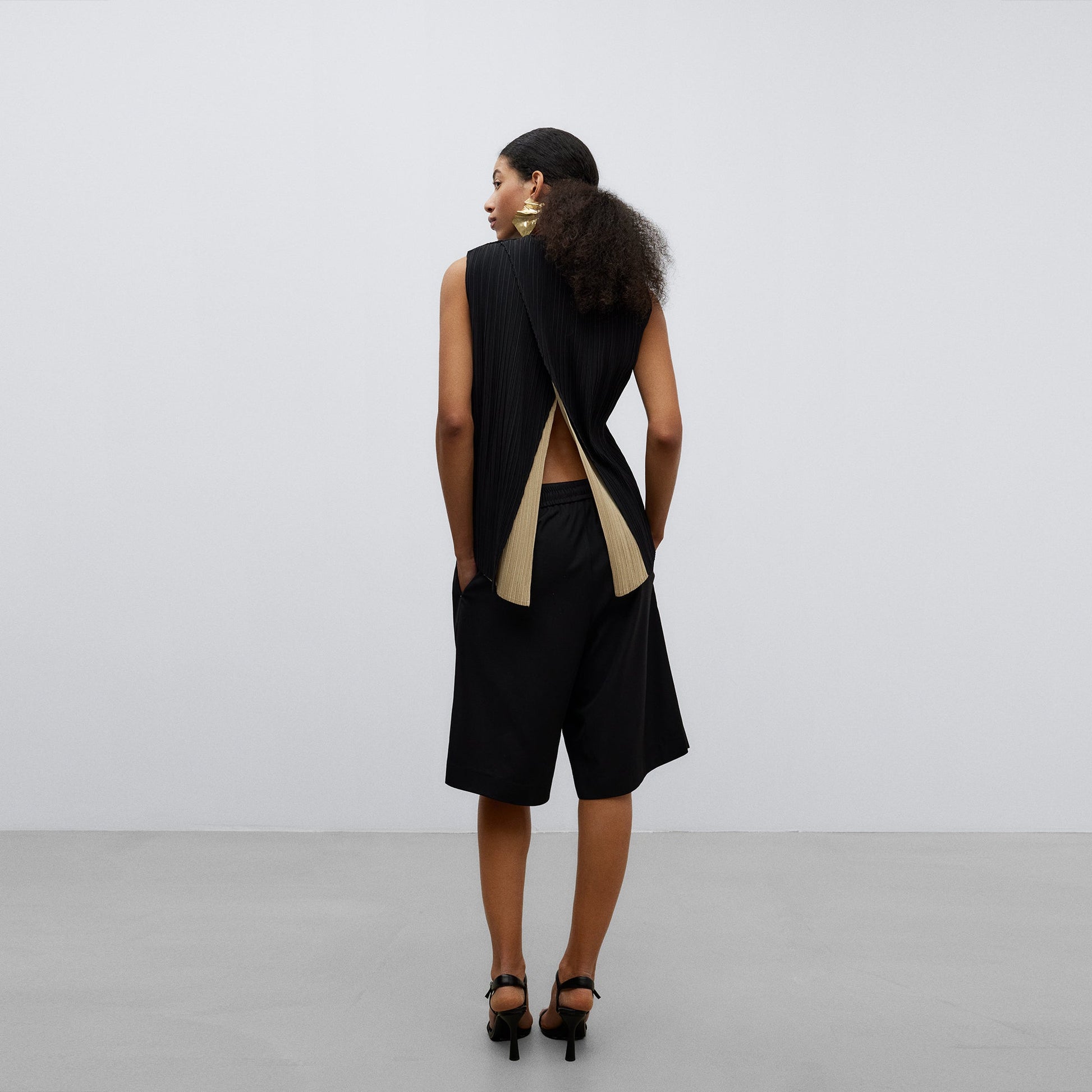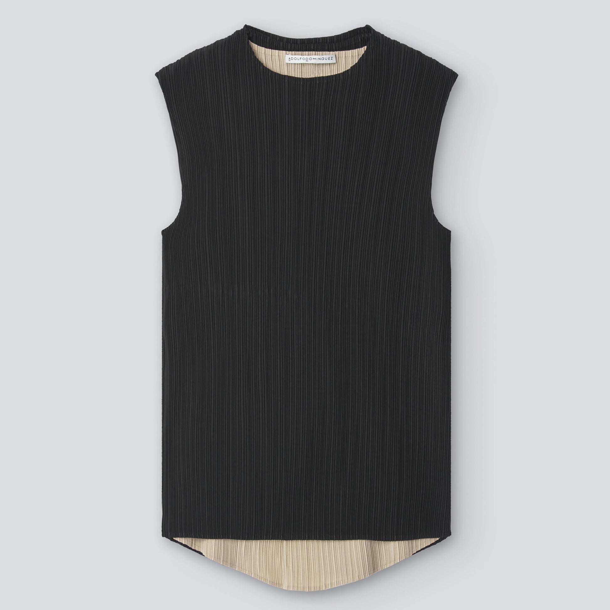 Crinkle Recycled Polyester Black Top Woman. Constrasting Back. Crew Collar. Sleeveless.