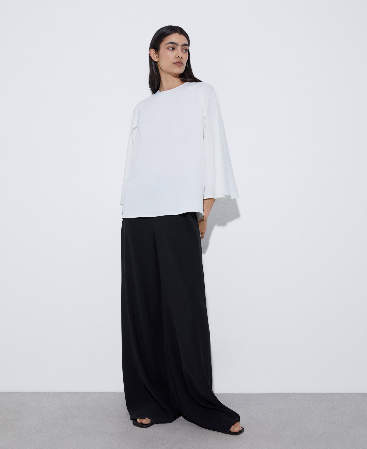 Cocktail shirt with a box collar and a straight line. One of its layers, which runs from the back to the chest, forms a false sleeve by means of a hidden button on the chest.