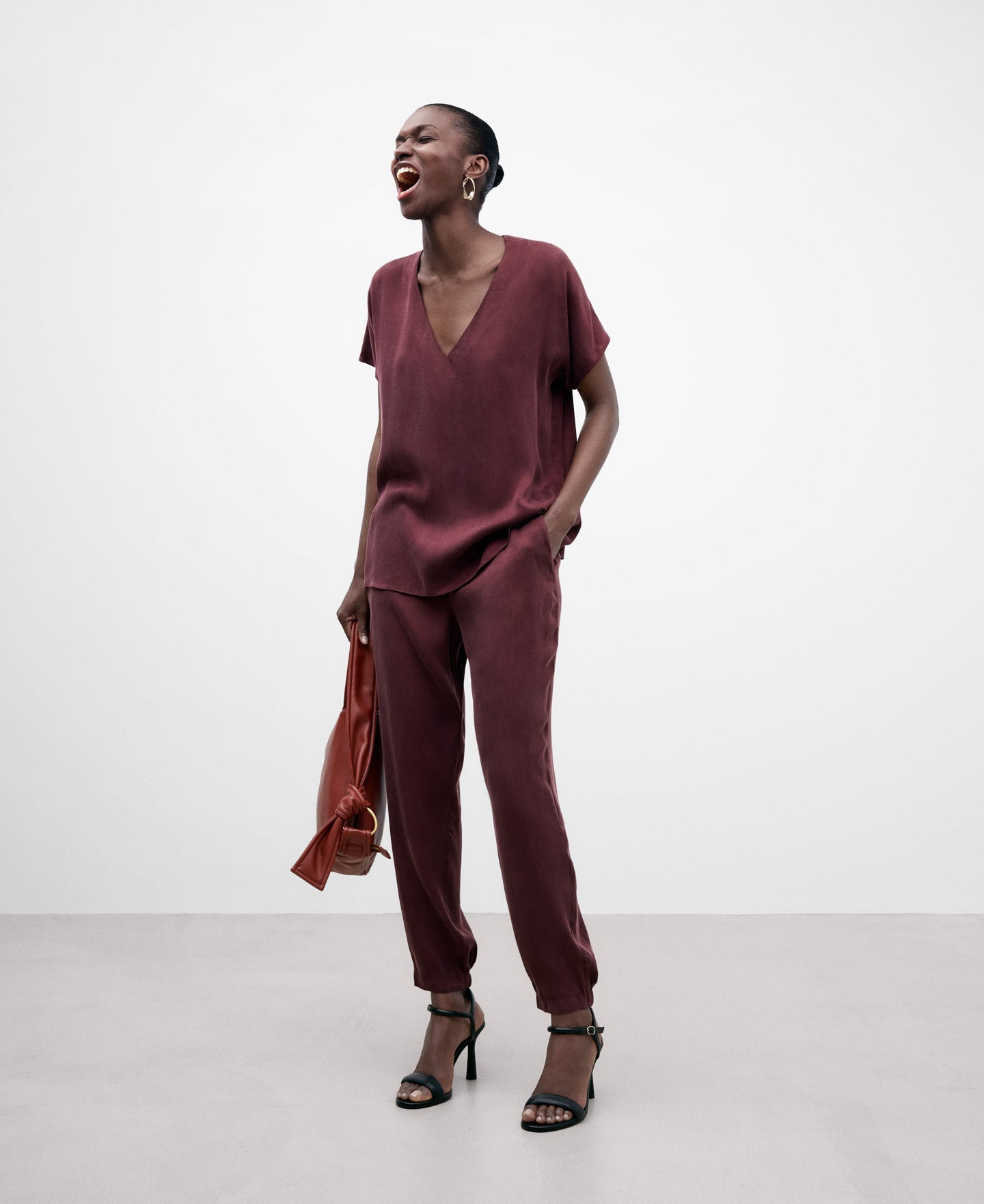 Description: Introducing our exquisite Japanese sleeve blouse from Adolfo Dominguez. This elegant piece features a flattering V neckline that adds a touch of sophistication to your ensemble. Crafted from luxurious cupro fabric, it offers a sumptuously soft and smooth feel against your skin. The blouse is designed with a straight hem, creating a sleek and polished look. Elevate your style with this timeless and versatile wardrobe essential.