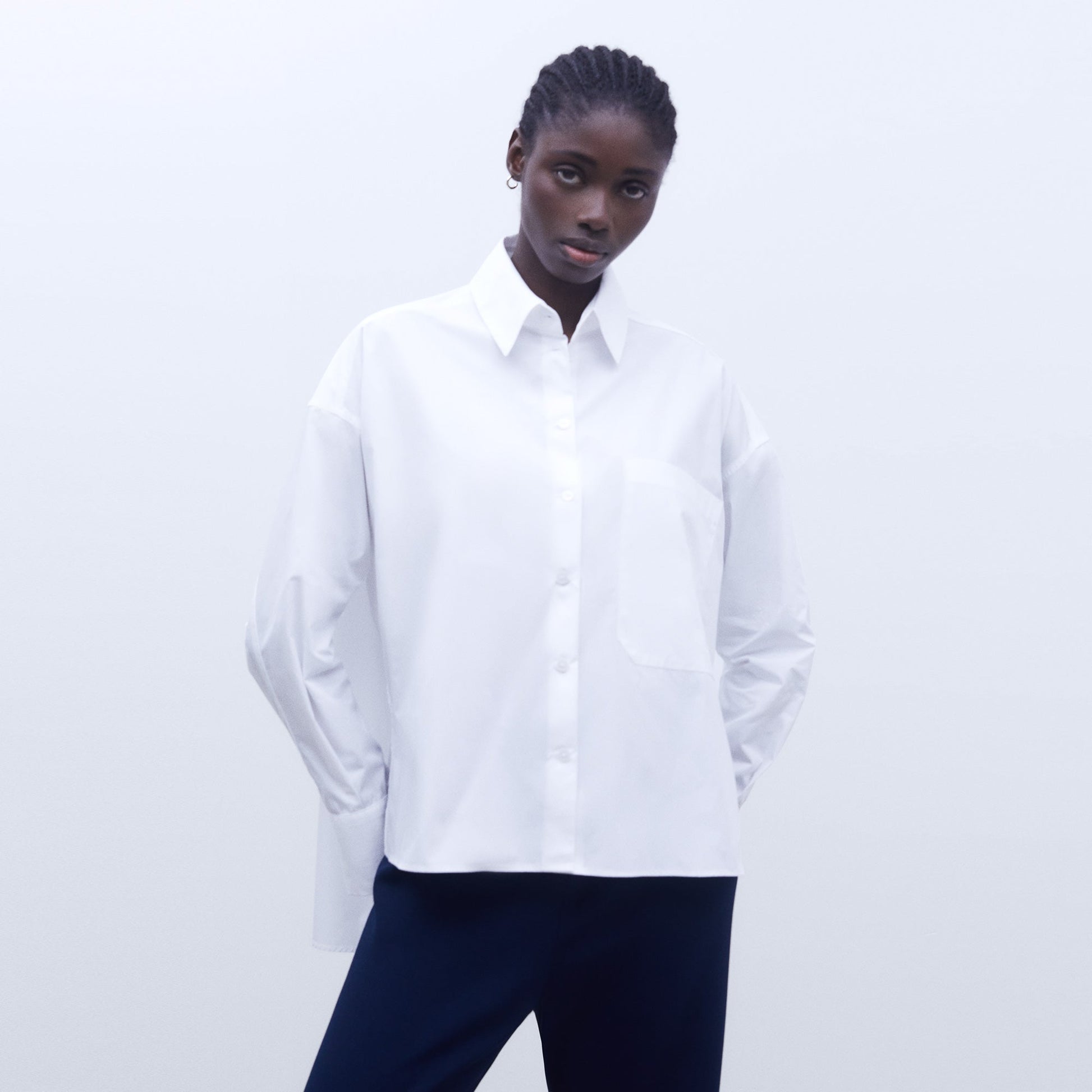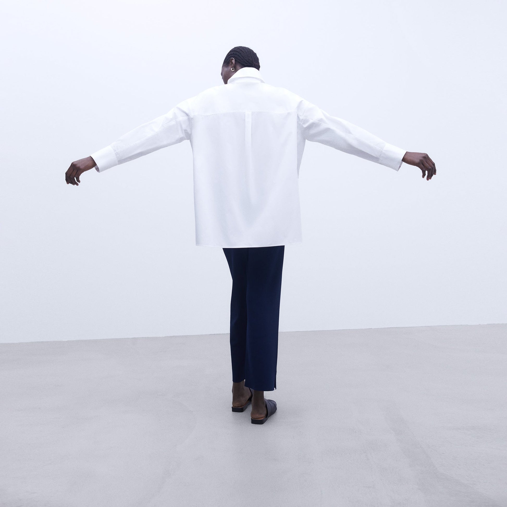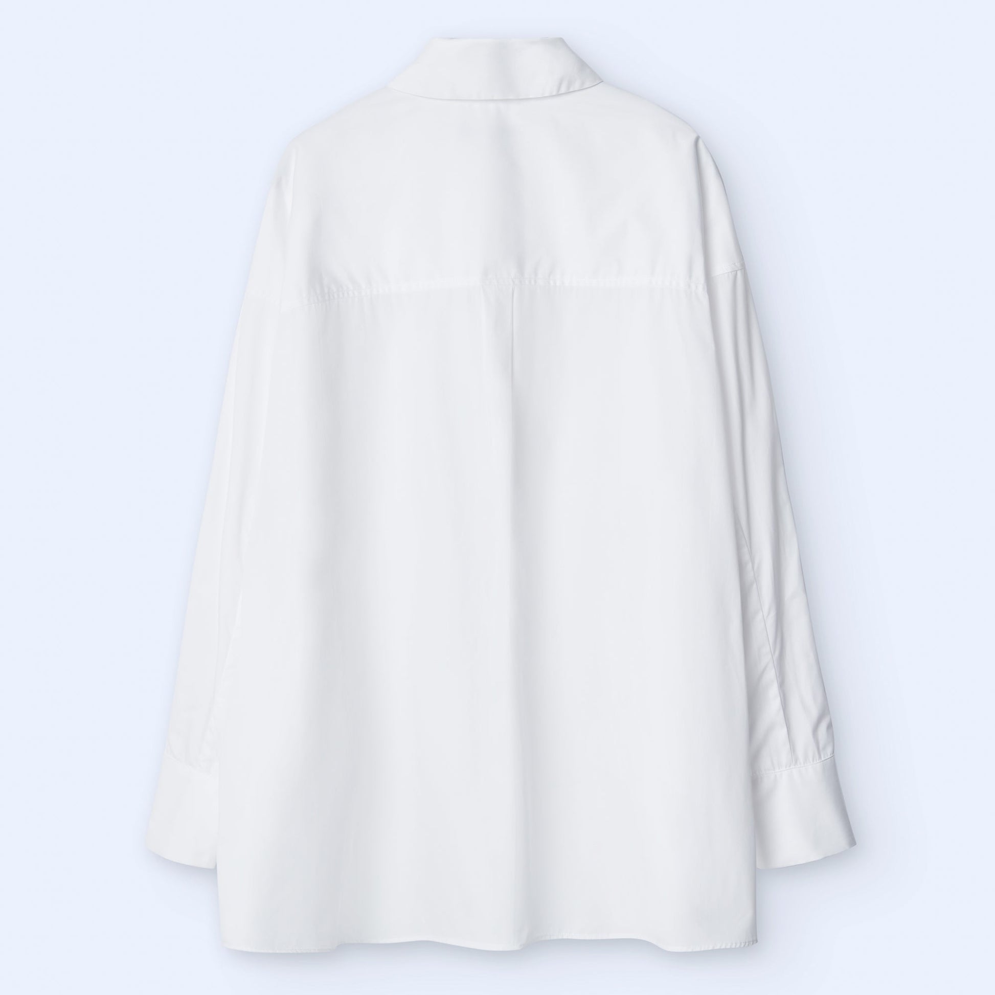 Oversize cotton shirt with a central button fastening. This shirt features a lapel collar, side vents, a front pocket, and a yoke. The open sides and asymmetric back add a unique touch to this classic design.