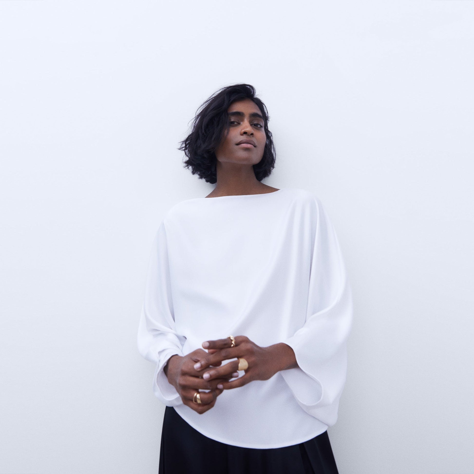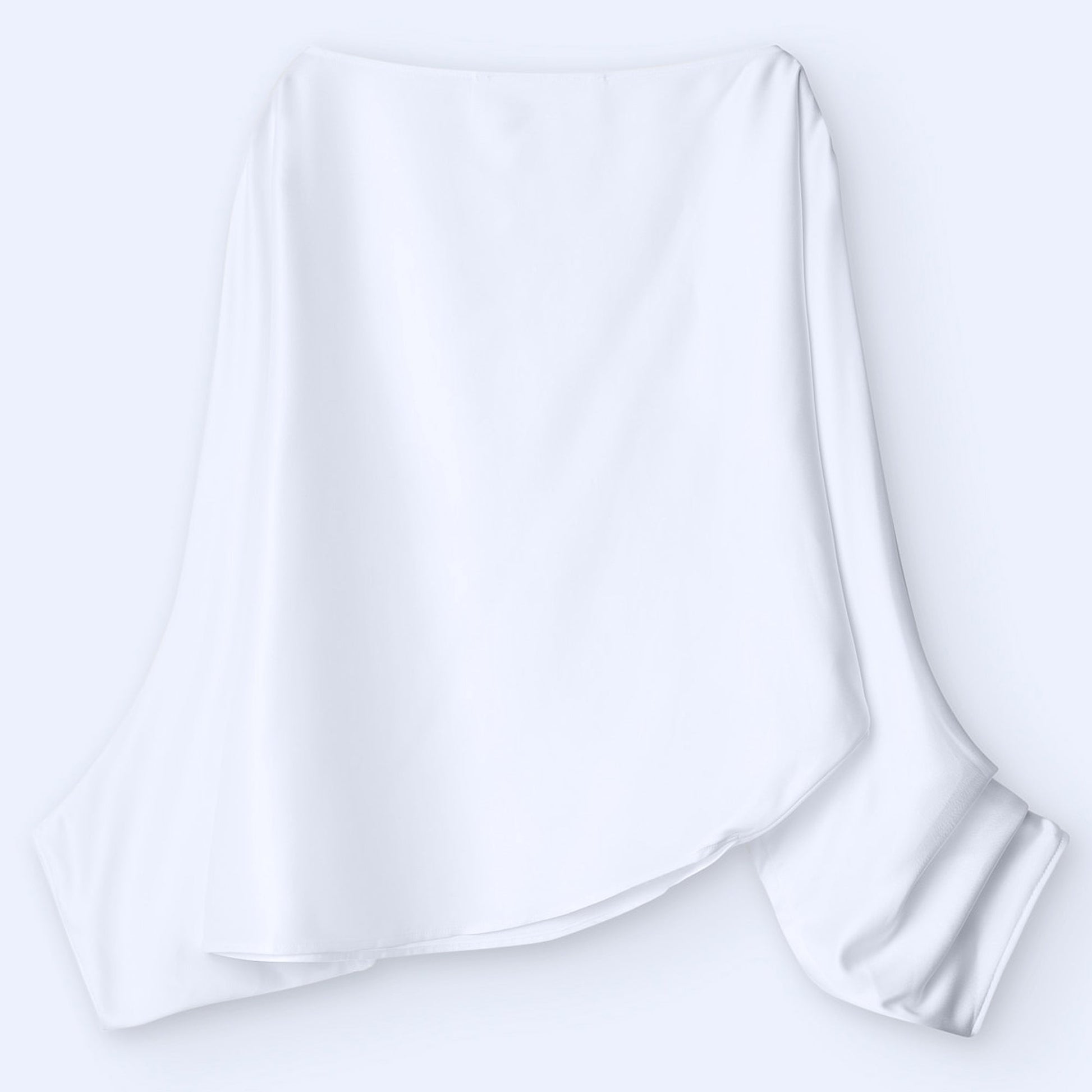 Bateau collar blouse with an elegant and sophisticated design. This blouse features an asymmetric Japanese sleeve and a gathered cuff, adding a unique touch to the overall look. The blouse also has an asymmetric hem, creating a modern and stylish silhouette.