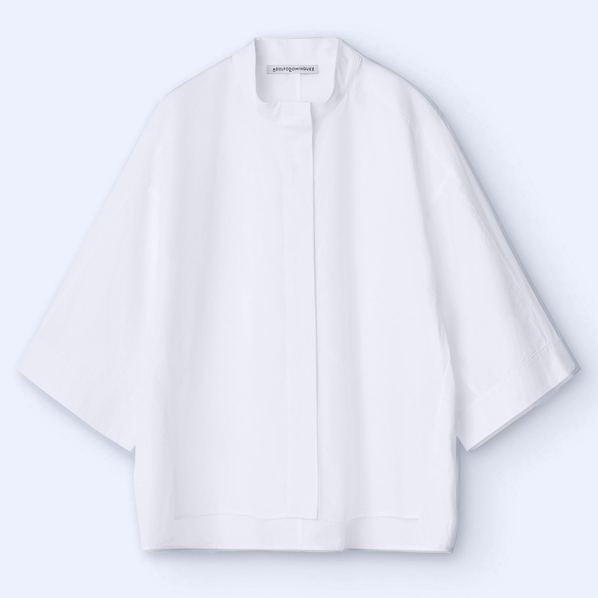 Elbow length sleeves with cuffs. Central button fastening with placket. Embroidered vintage logo. Side slits. Asymmetric hem.
