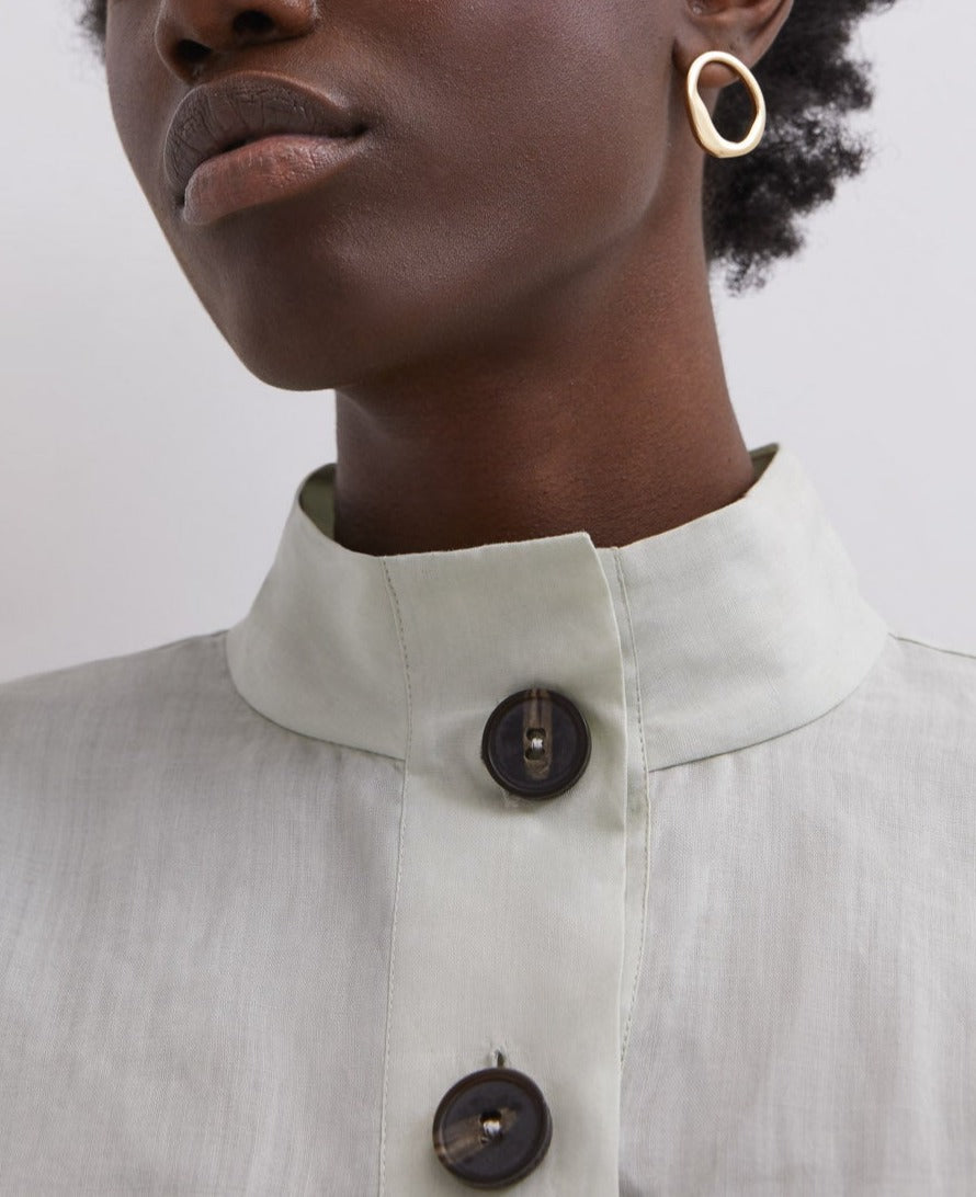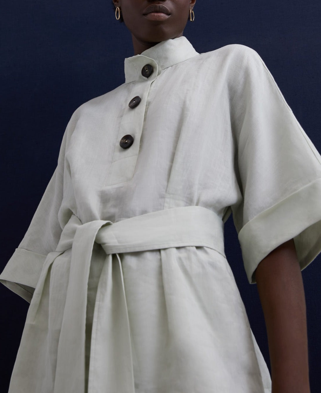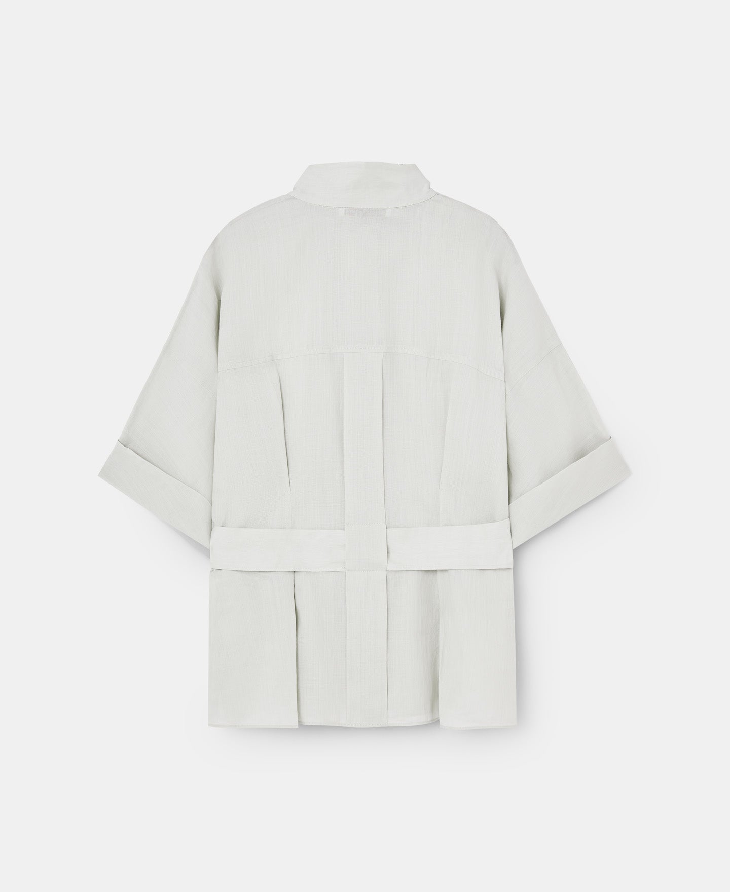 Visa to Japan. Kimono like shirt made from ramie, a strong natural fibre with a low environmental impact. Buttoned, with mao collar, maxi buttons and wide sleeves at the elbow. Note the crossover detail on the back and adjust its volume with the bow. A real oriental breath of fresh air.100% Ramie