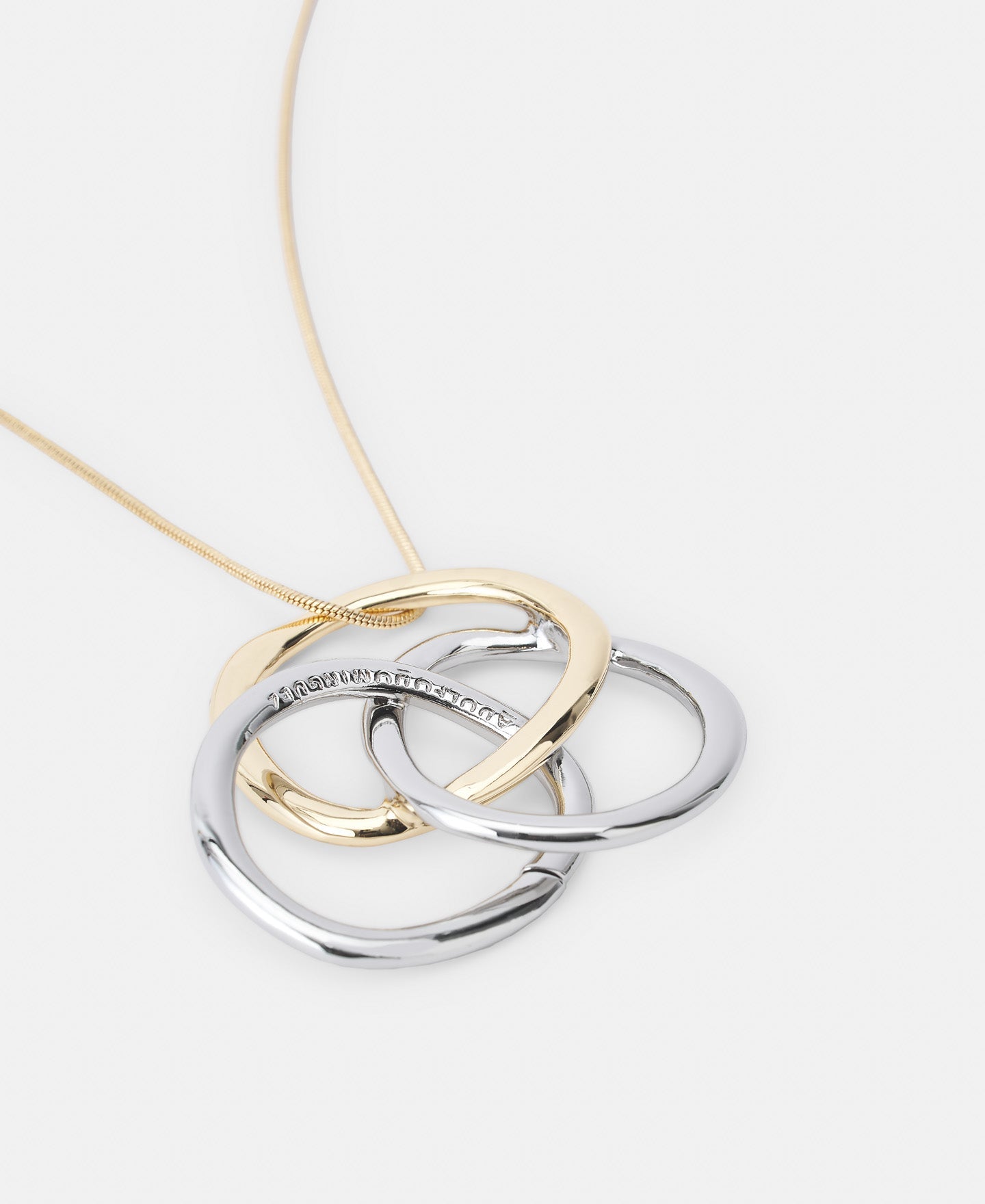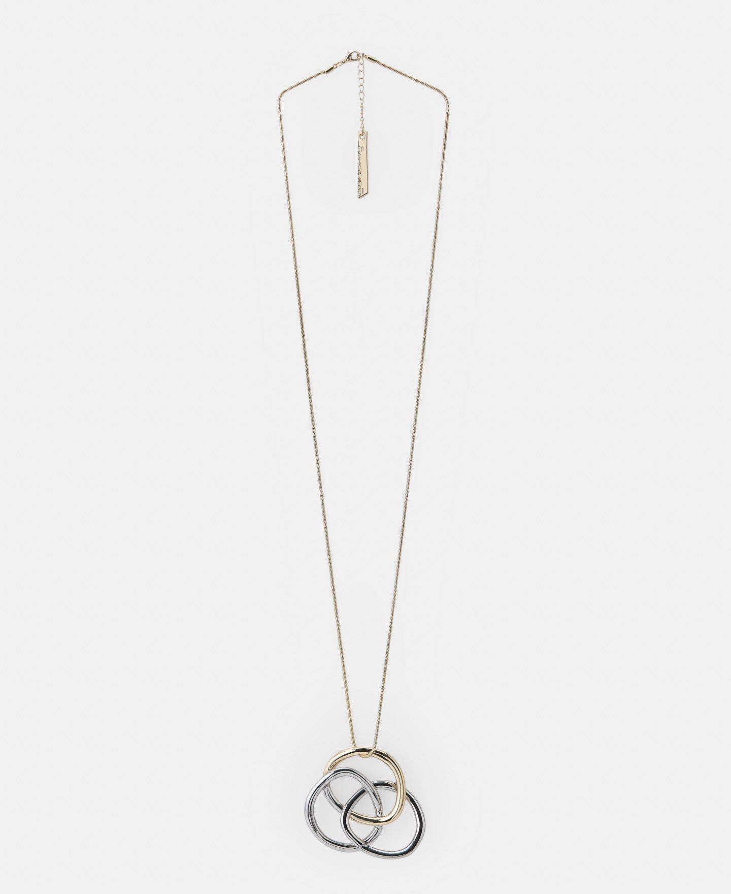 The power of three rings in one. Zinc-modeled triple hoop necklace. The irregular cylinders are joined together to form a single piece. With engraved logo on one of the rings. Adapt the length with its adjustable collar.Length: 80Cm