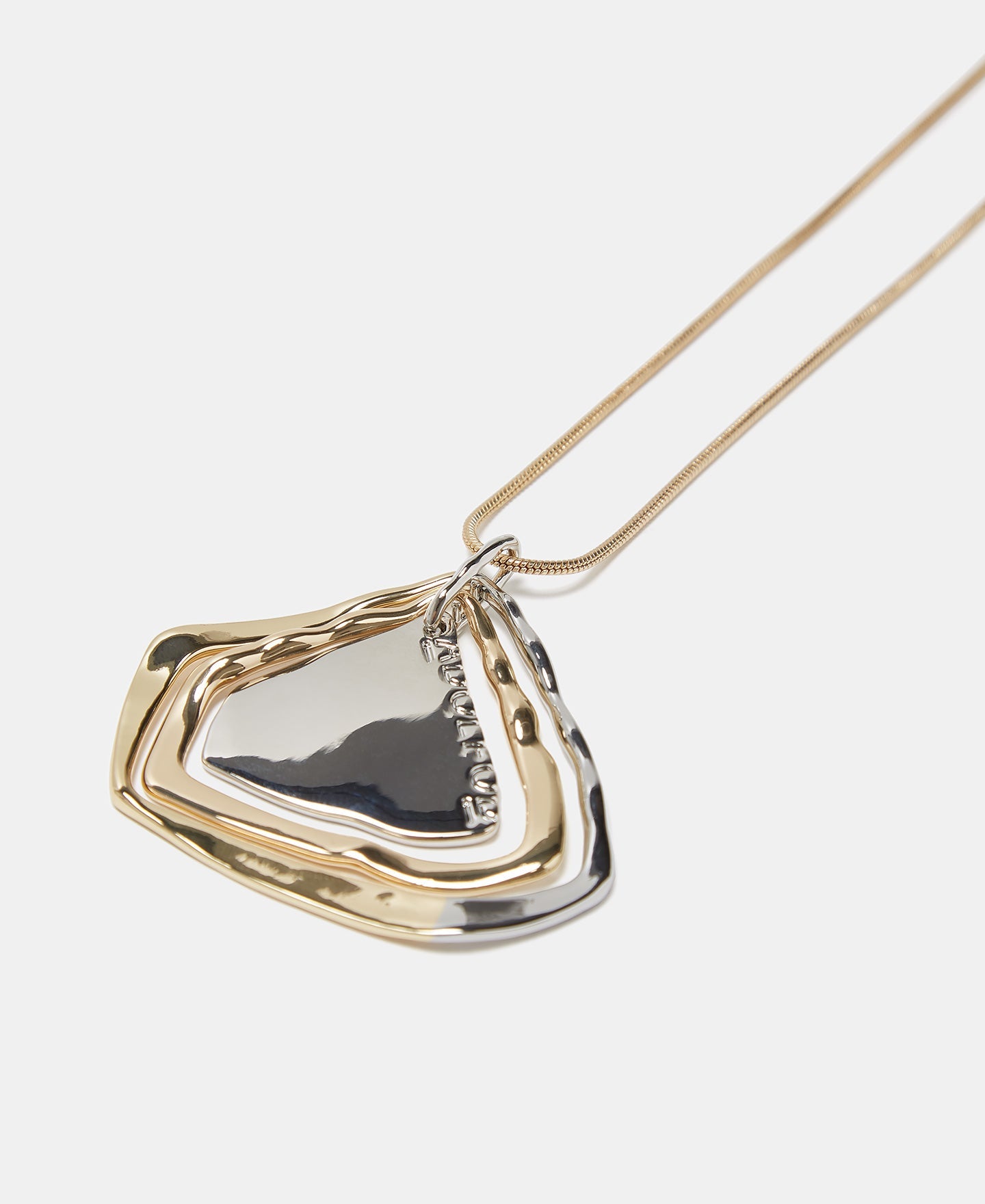 The final touch. Gold and silver organic-shaped multi-metal necklace. A simple and imperfect piece to shine from the chest and define your outfit. Complete the set with its matching bracelet and earrings.