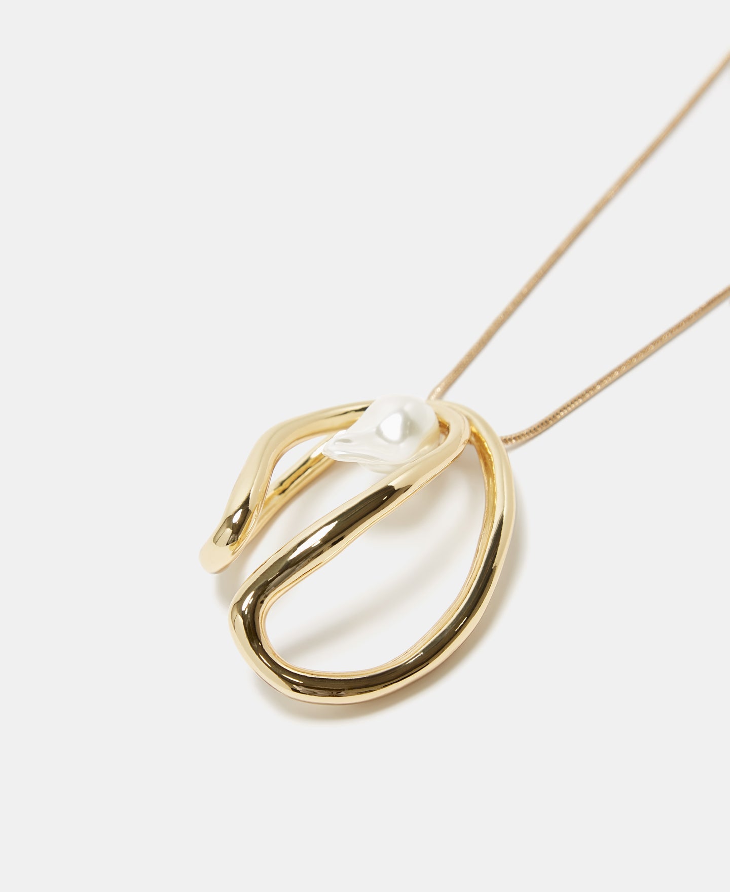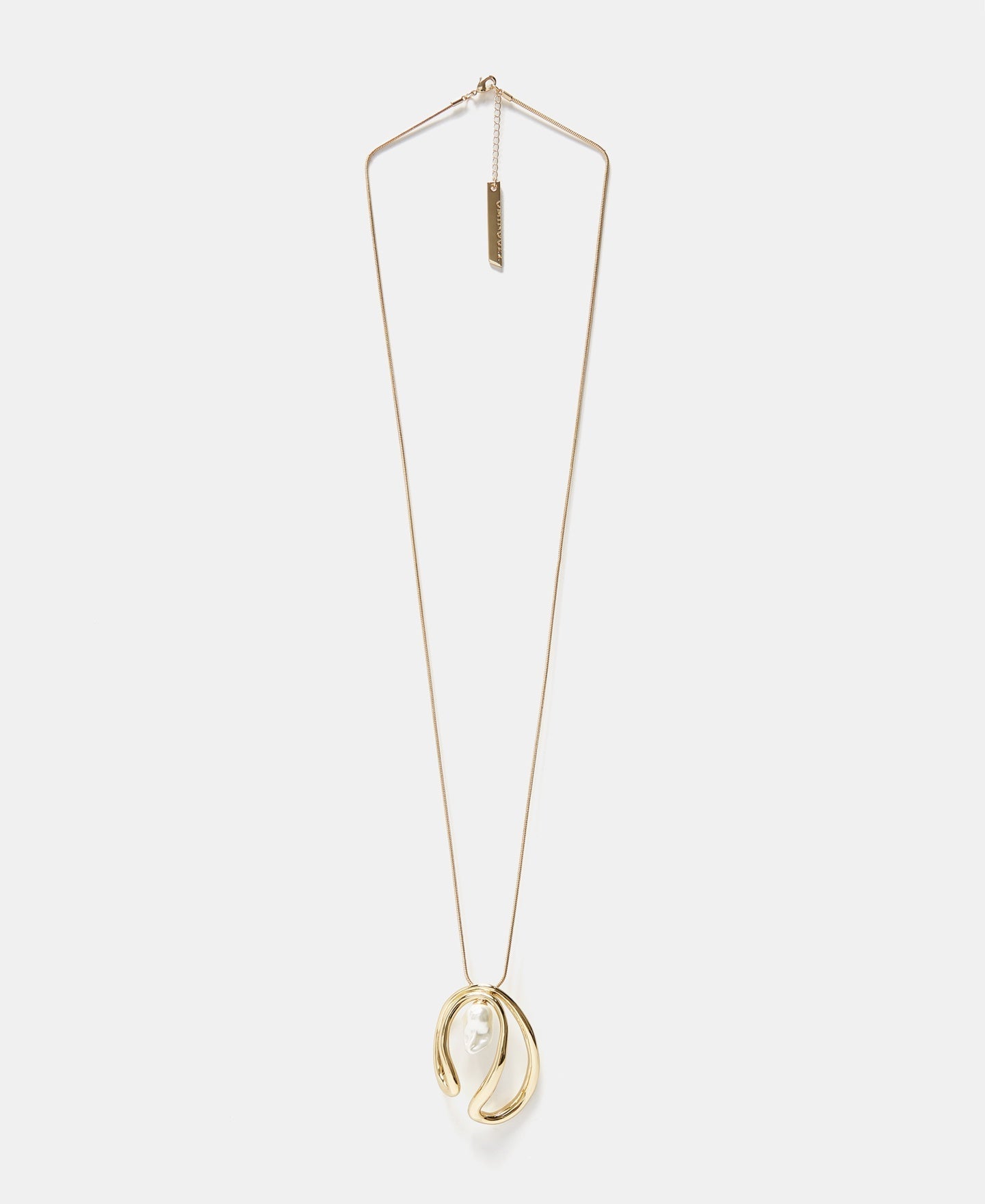 We have elaborated this necklace taking advantage of the most flexible qualities of the metals, allowing them to turn to create a circular volume. We have decorated it with a resin pearl and an adjustable stopper. A sculptural piece with bracelet and matching earrings.Length: 84 Cm