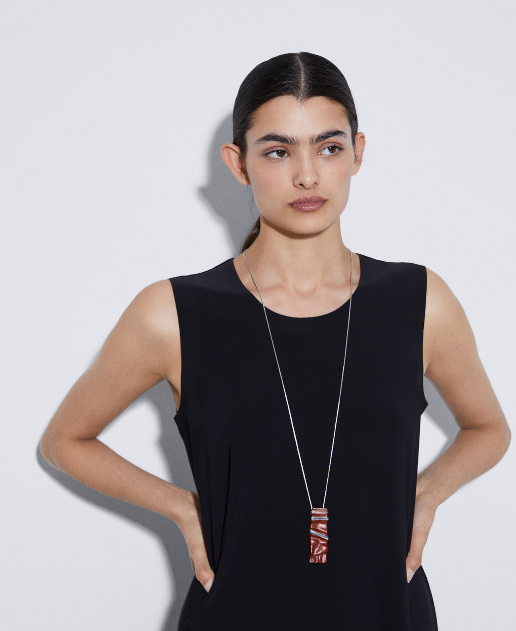 Metal and wood pendant. With adjustable length and logoed terminals.6,5 x 2 x 82 cm