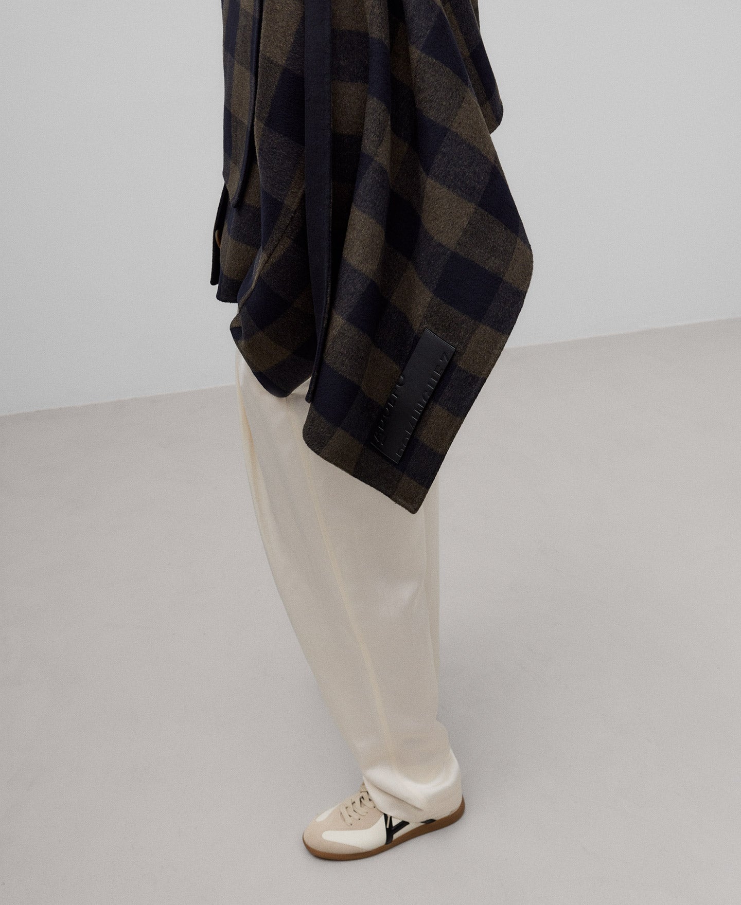 Double-faced checkered jacket woman. Merino wool blend. Long sleeve. High collar with two buttons closure. Buttoning on the front. Pockets on the side.