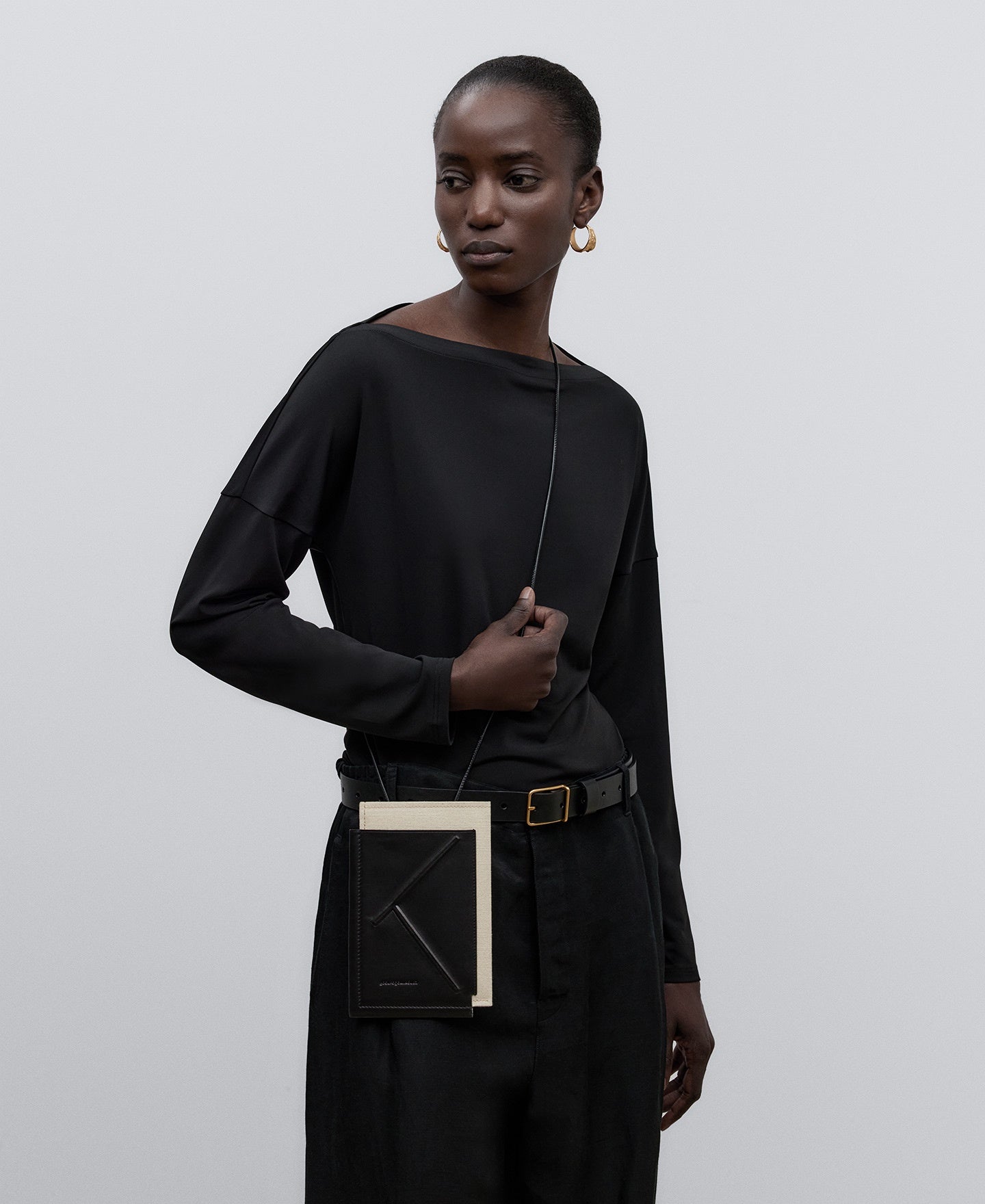 Dual-Texture Mobile Phone Holder Woman. Canvas Body. Leather Frontal Pocket. Leather Card Holder. Long Adjustable Strap. Engraved Logo. Ágora Theme.