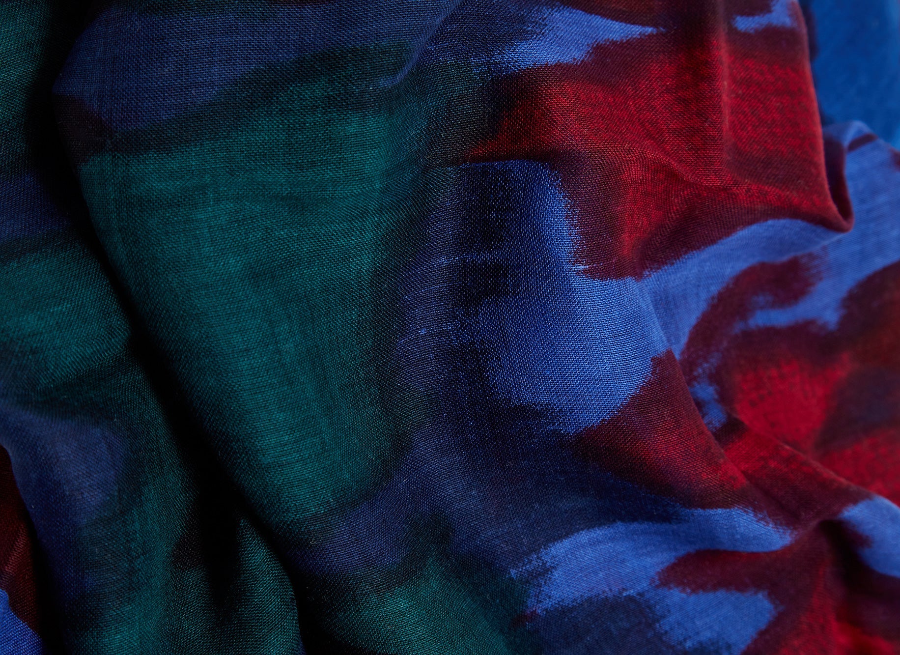 Crafted from a soft viscose, this scarf is embellished with an abstract print on a rich multi-colour background, and has short frayed edges.