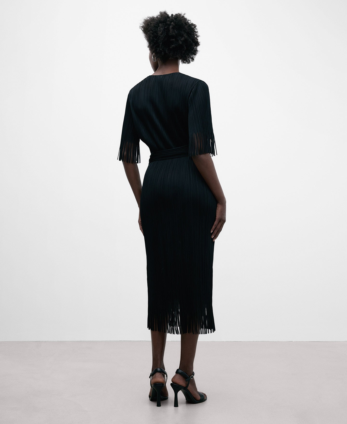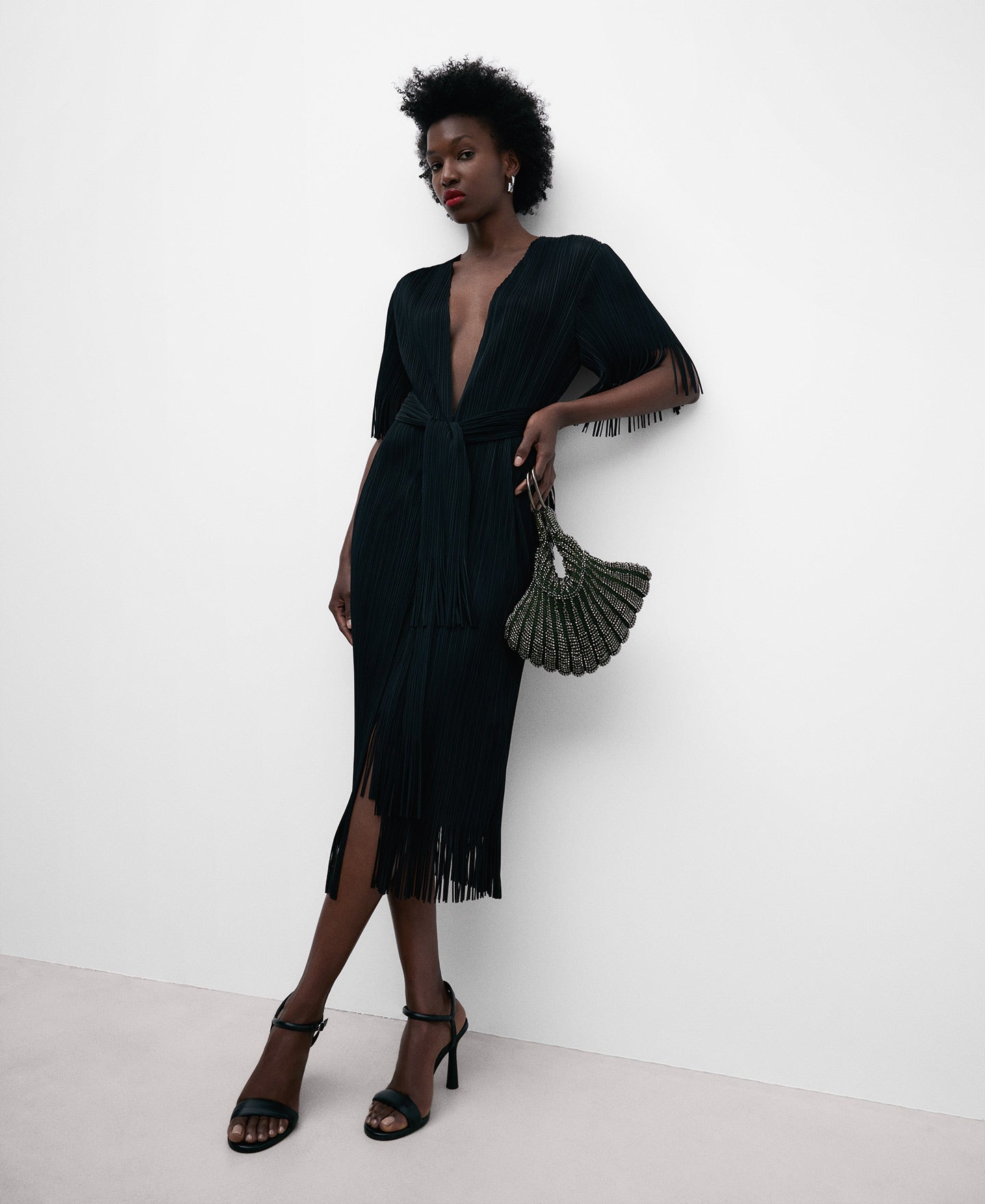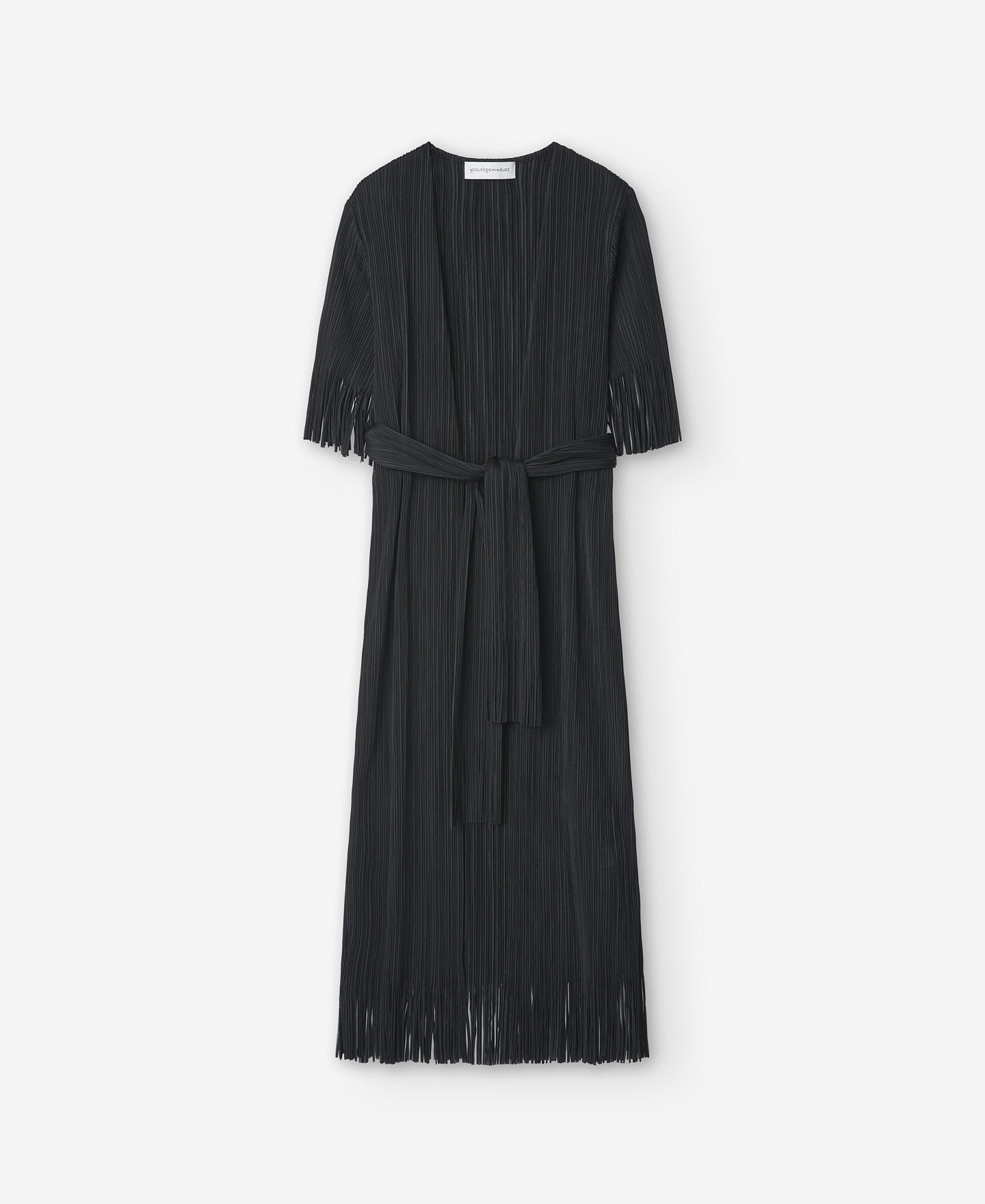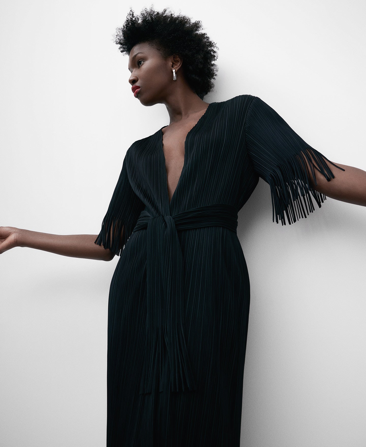 Description: Introducing our exquisite Black Recycled Polyester Crinkle Jacket from Adolfo Dominguez. This stunning jacket features a unique crinkle texture that adds a touch of sophistication to any outfit. With its short sleeves and open design, it effortlessly combines style and comfort. The addition of a belt allows for a customizable fit, while the fringed edges on the sleeves and hem add a playful and trendy touch. Crafted from recycled polyester, this jacket not only looks fabulous but also contributes to a more sustainable fashion industry. Elevate your wardrobe with this luxurious piece that embodies both elegance and eco-consciousness.