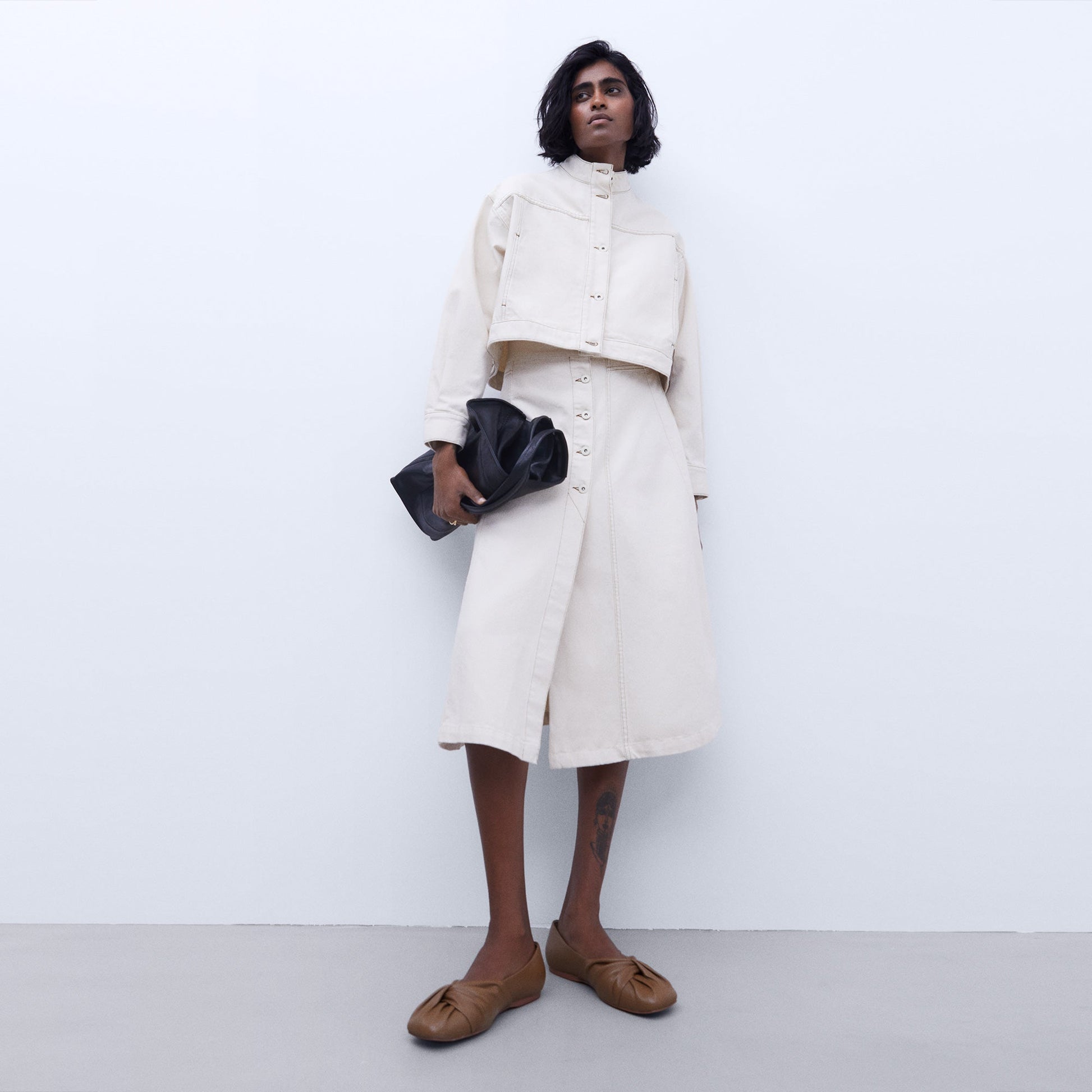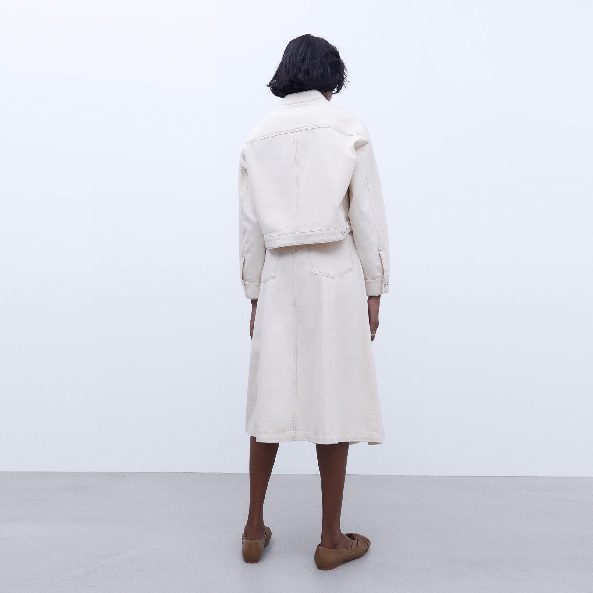 This denim skirt is made from 100% cotton, ensuring a comfortable and breathable fit. It features a central set of buttons, adding a touch of elegance to the design. The skirt also has a side pocket and a back patch pocket, providing convenient storage options. The topstitches in contrast add a stylish and trendy element to the overall look.