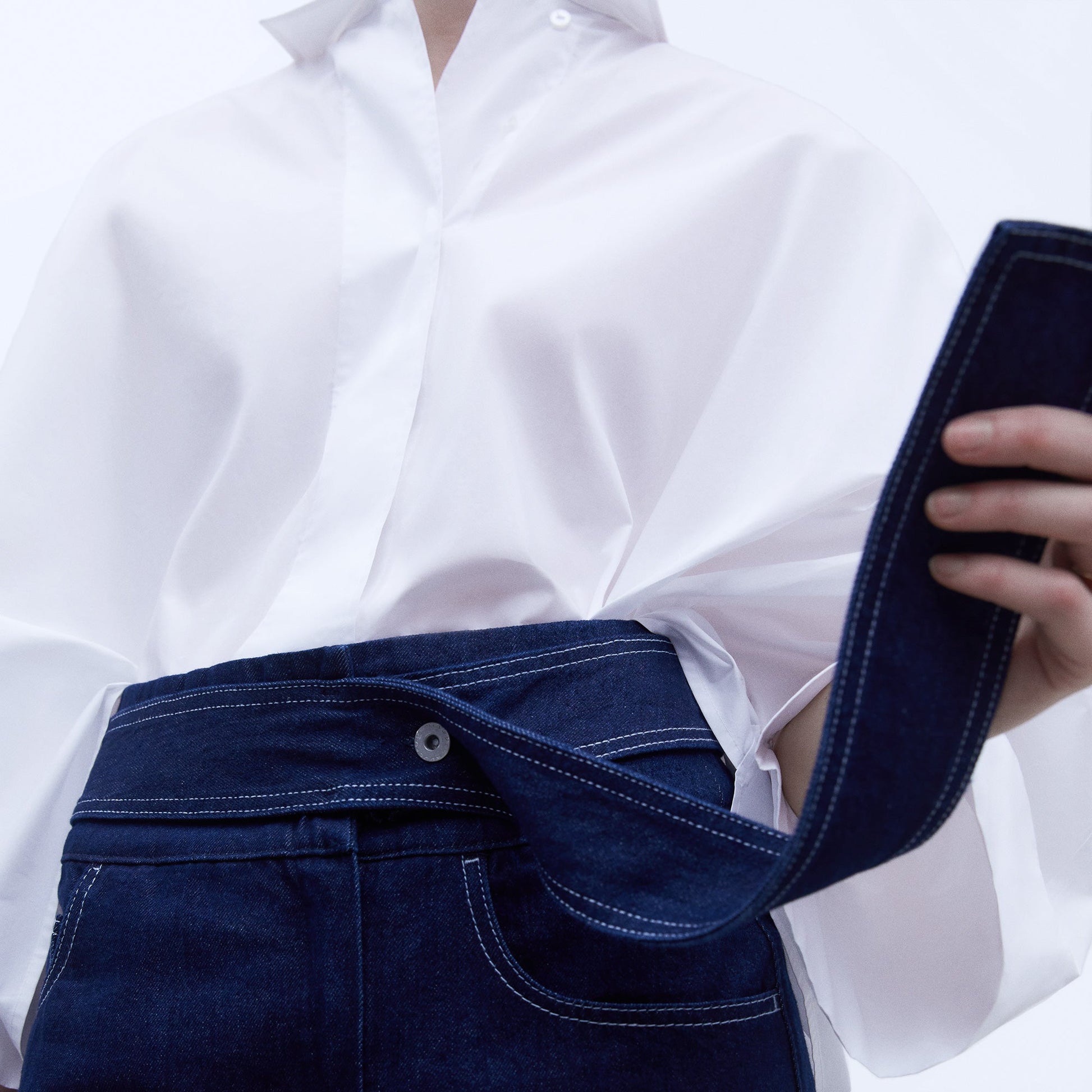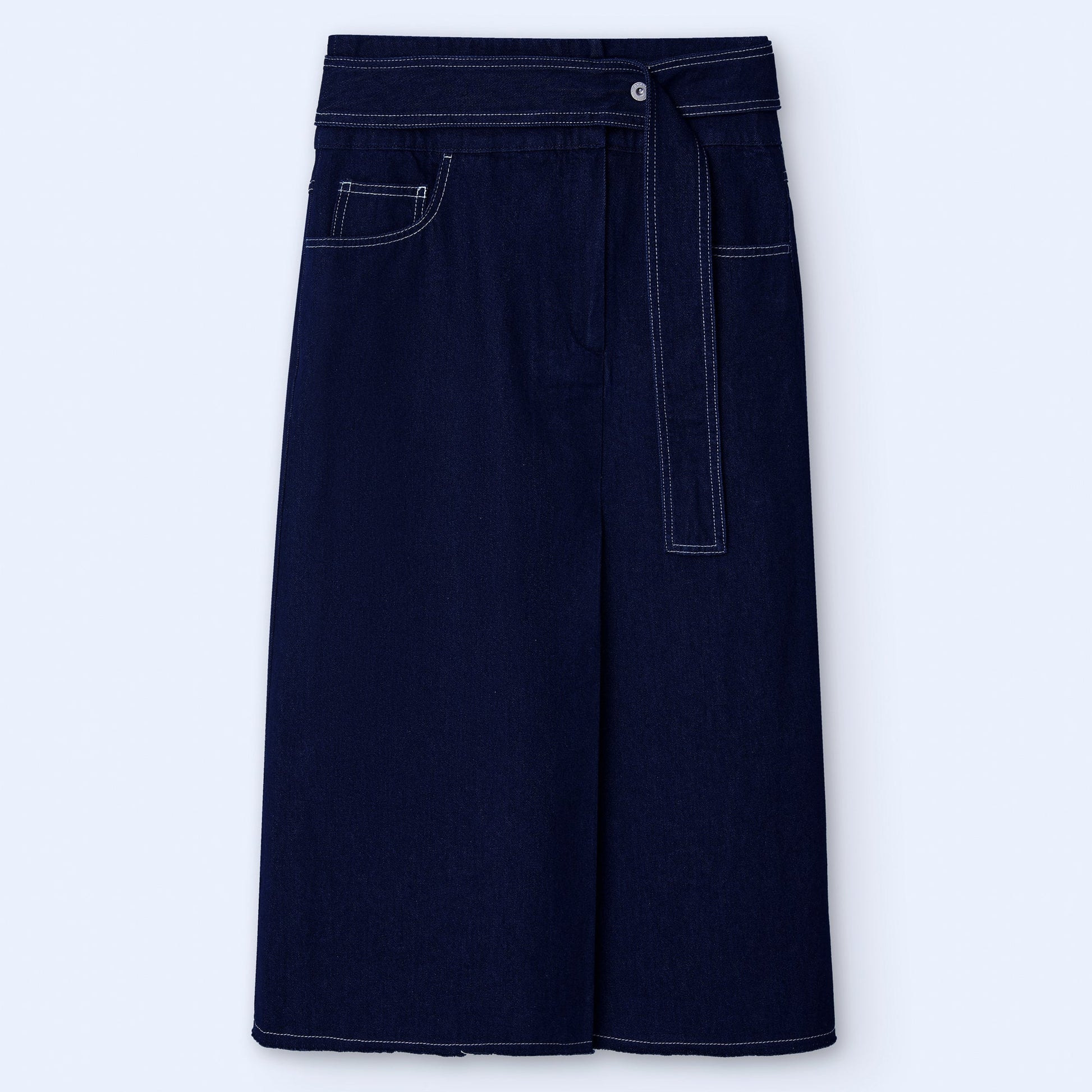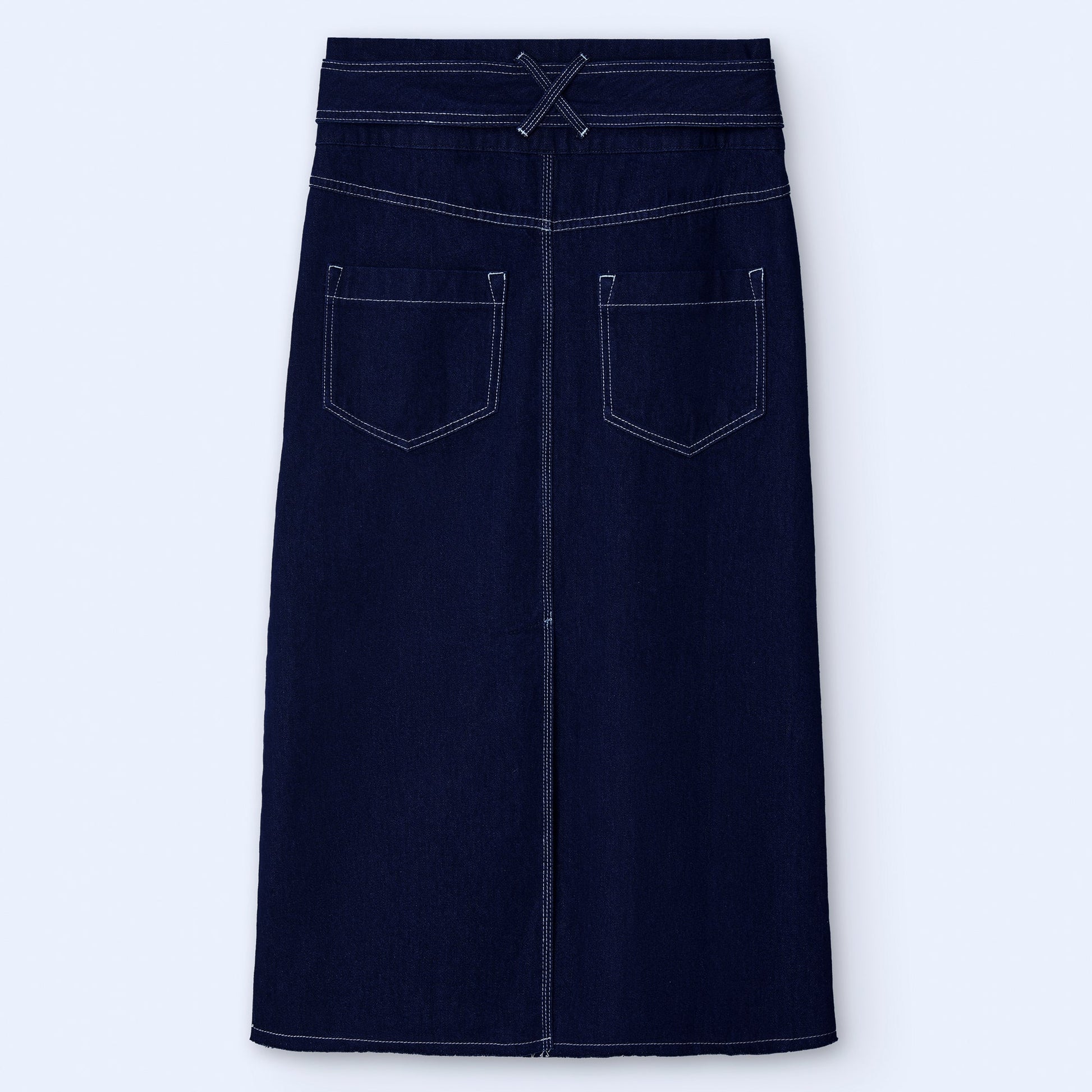 Cotton denim skirt. High waist. Long topstitched belt. Topstitches in contrast. Front pleat. Front and rear vent. Midi.