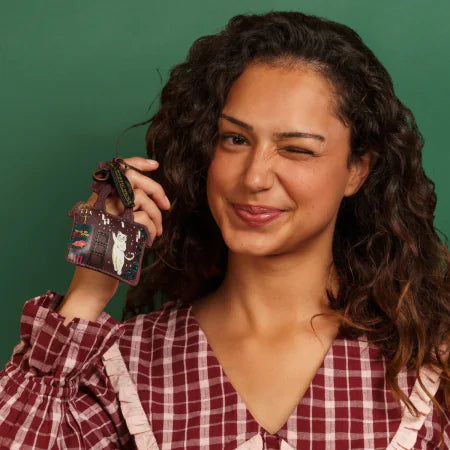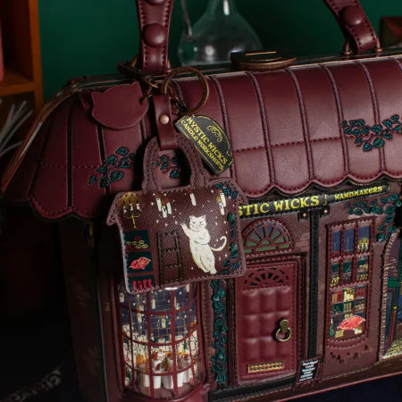 The Mystic Wicks Candle and Wandmakers Key Charm is your ultimate accessory enchantment! Crafted from vegan leather in the shape of a handbag, this little charmer features printed and appliqué details of a wand-wielding cat lighting candles and a cheeky “Too Hot to Candle” slogan on the reverse. Clip it to your bag or keys and show off your magical side this season!