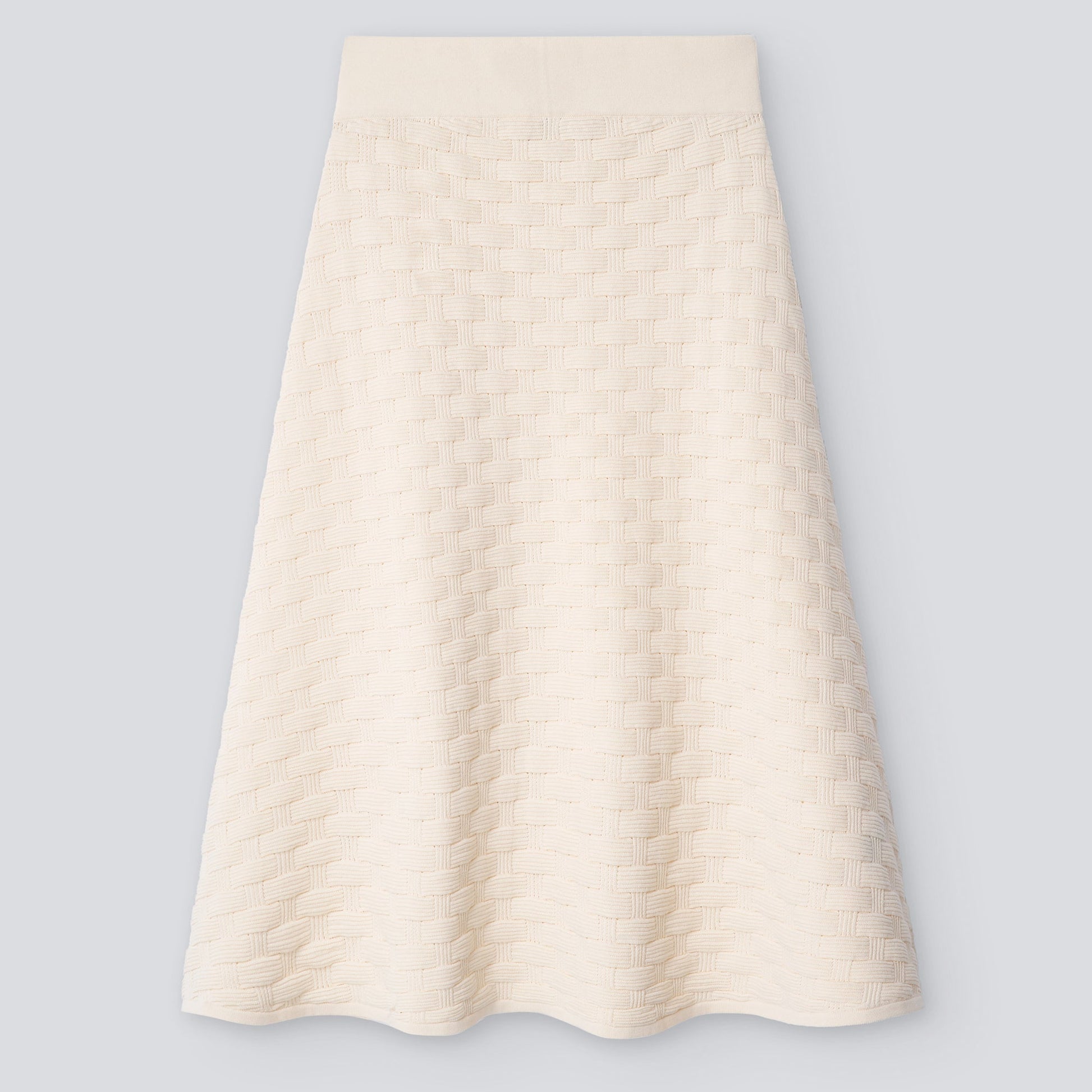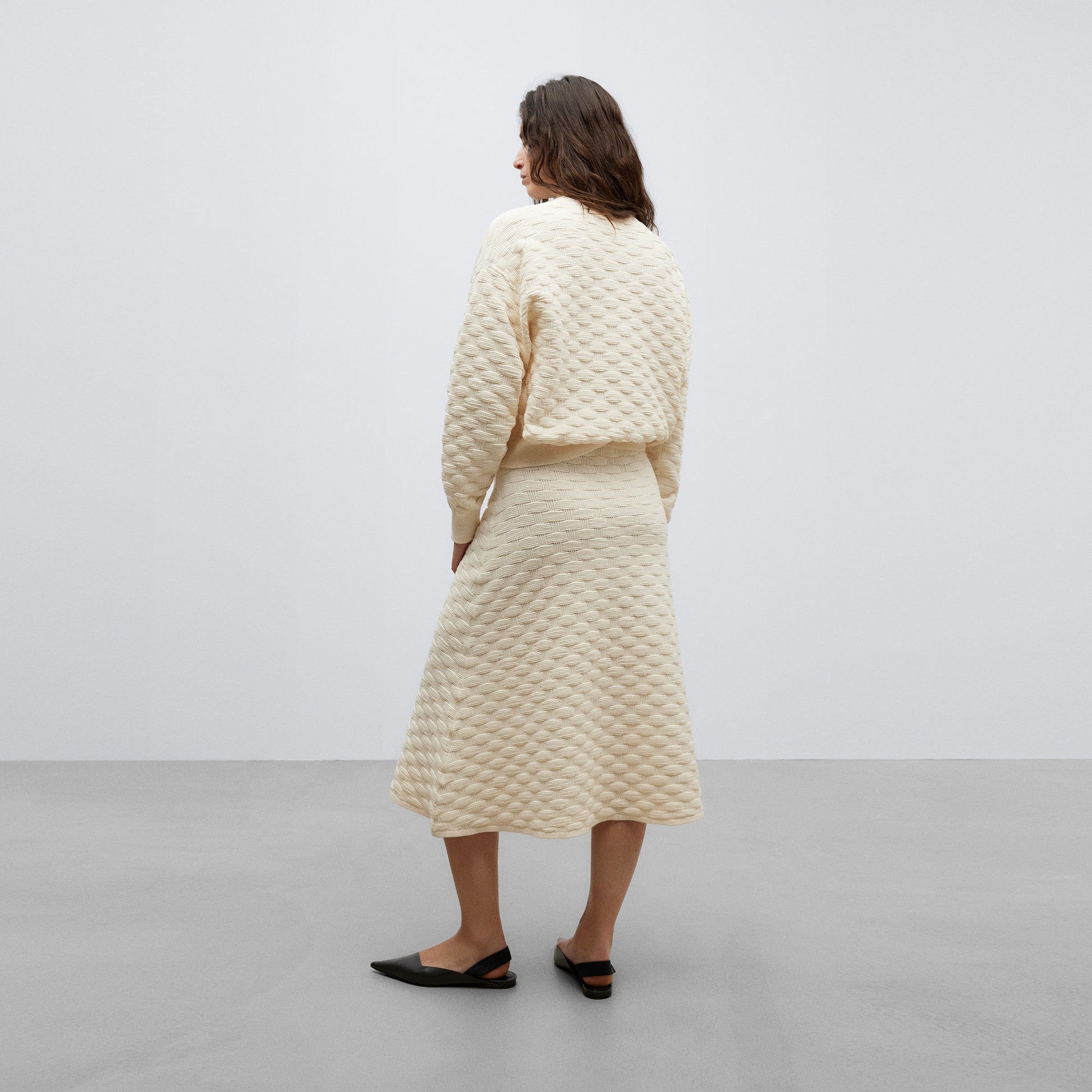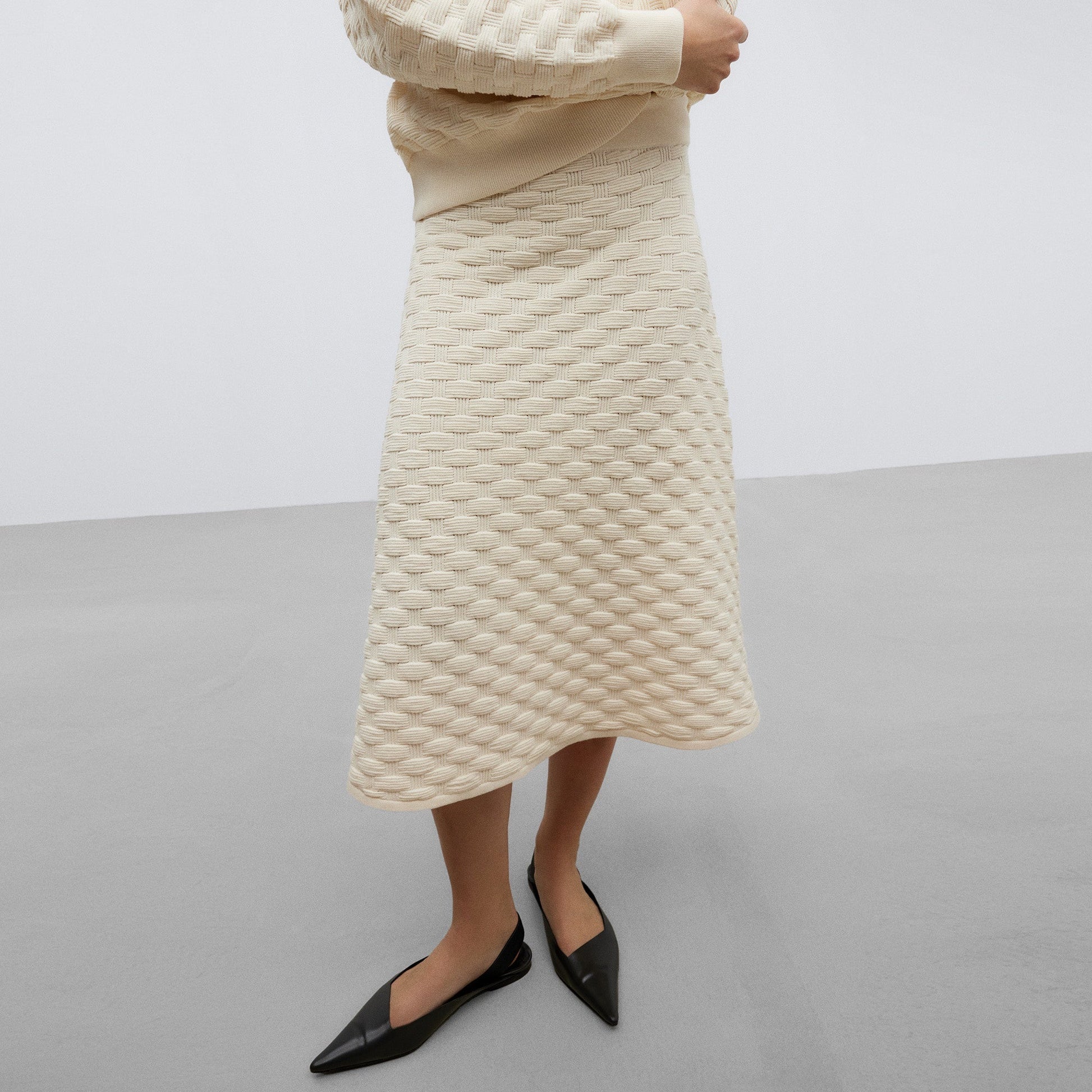 Cream Cotton Fabric Flared Skirt. Basket Weave Knit.