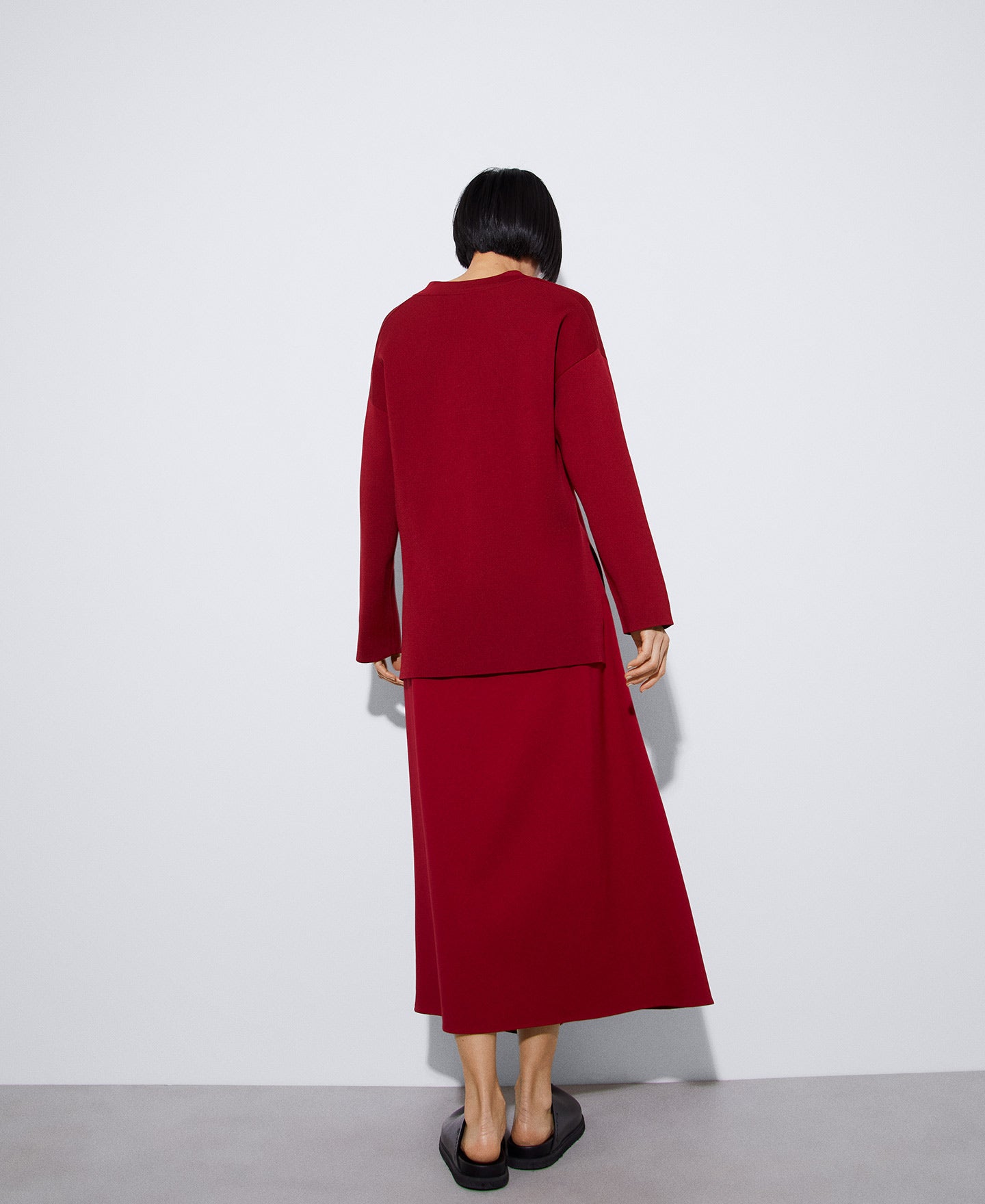 V-neck sweater in recycled nylon. In structured knit with double facing and tubular striped neckline. Long sleeves and straight hem.recycled nylon