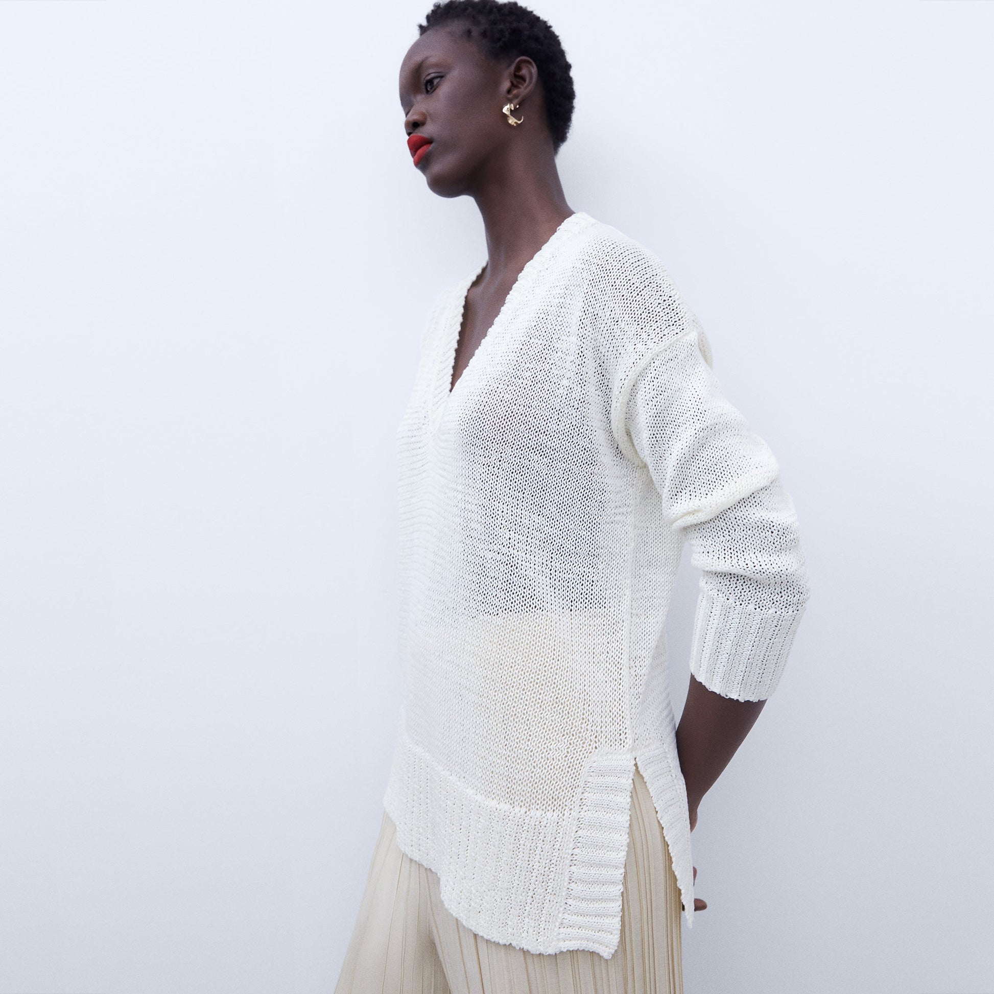 Stay cozy and stylish with this wide fit sweater from Adolfo Dominguez. It features a flattering V-neckline and long dropped sleeves for a relaxed and comfortable fit. The side vents add a touch of uniqueness to the design, while the wide ribbed trims provide a classic and timeless look.