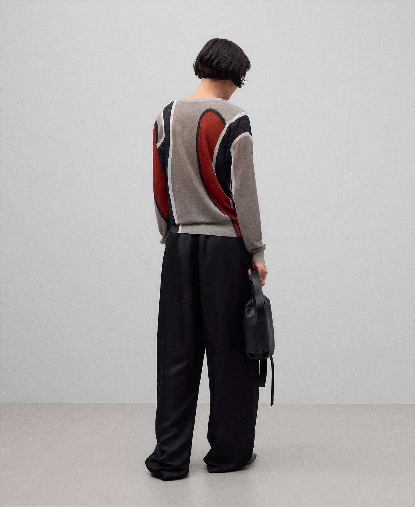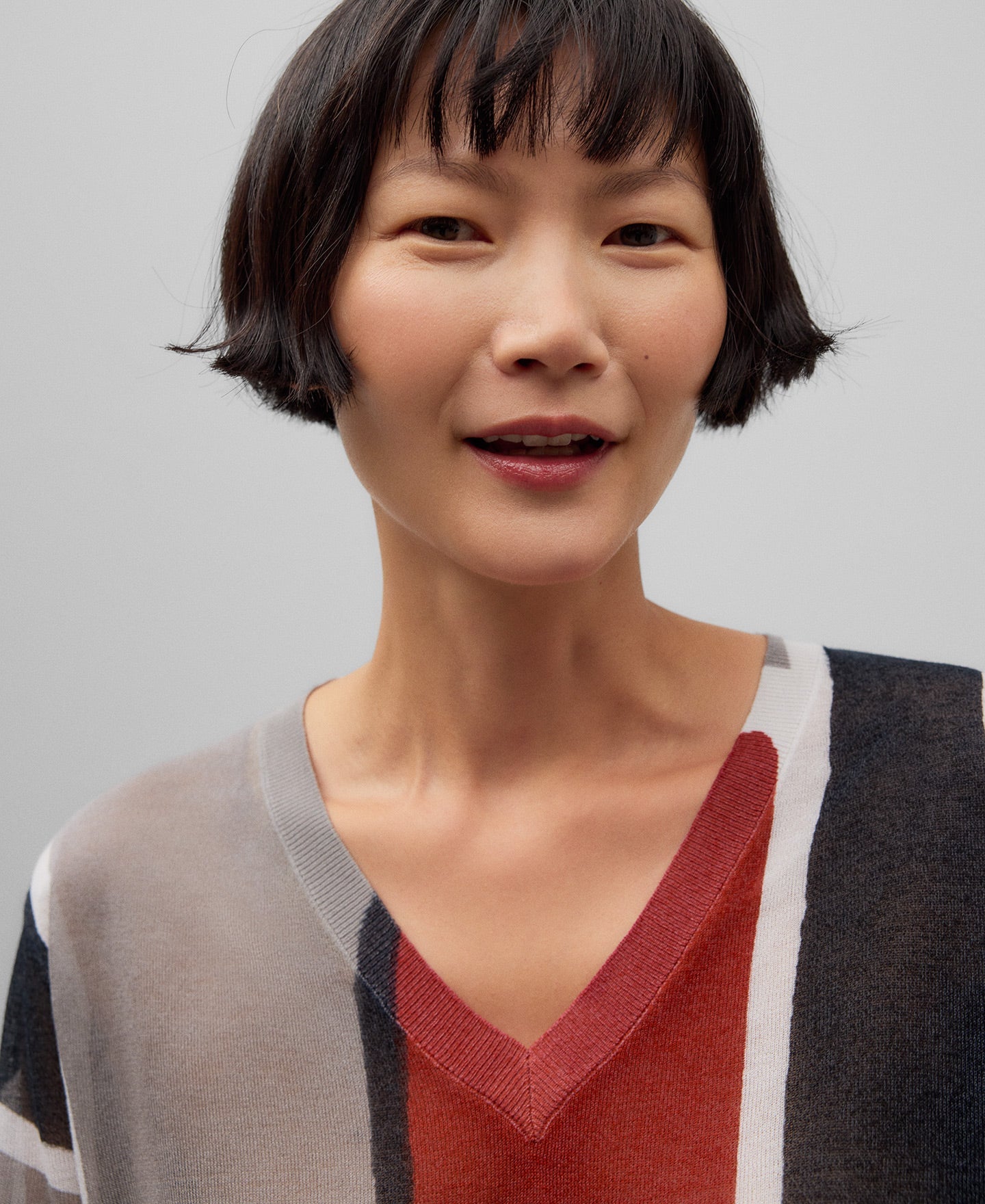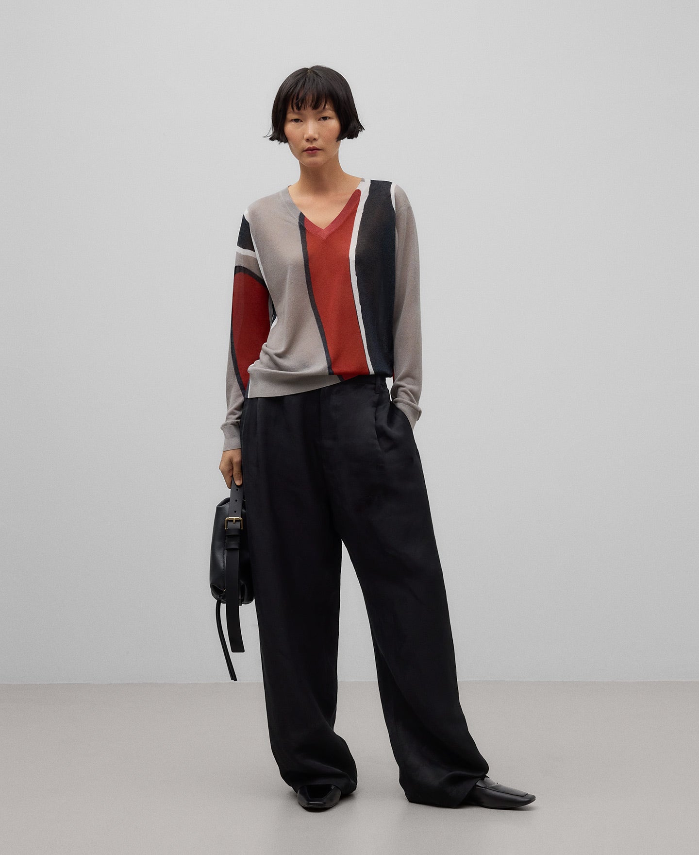 Printed fine knit sweater woman. V-neck. Fitted long sleeve. Ribbed hem.