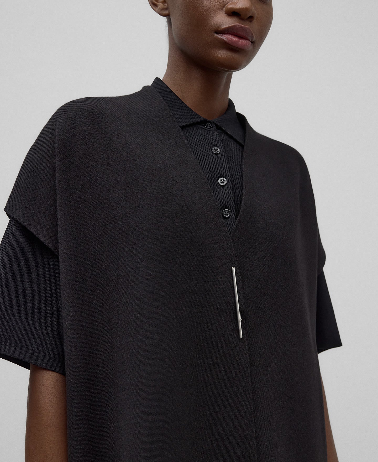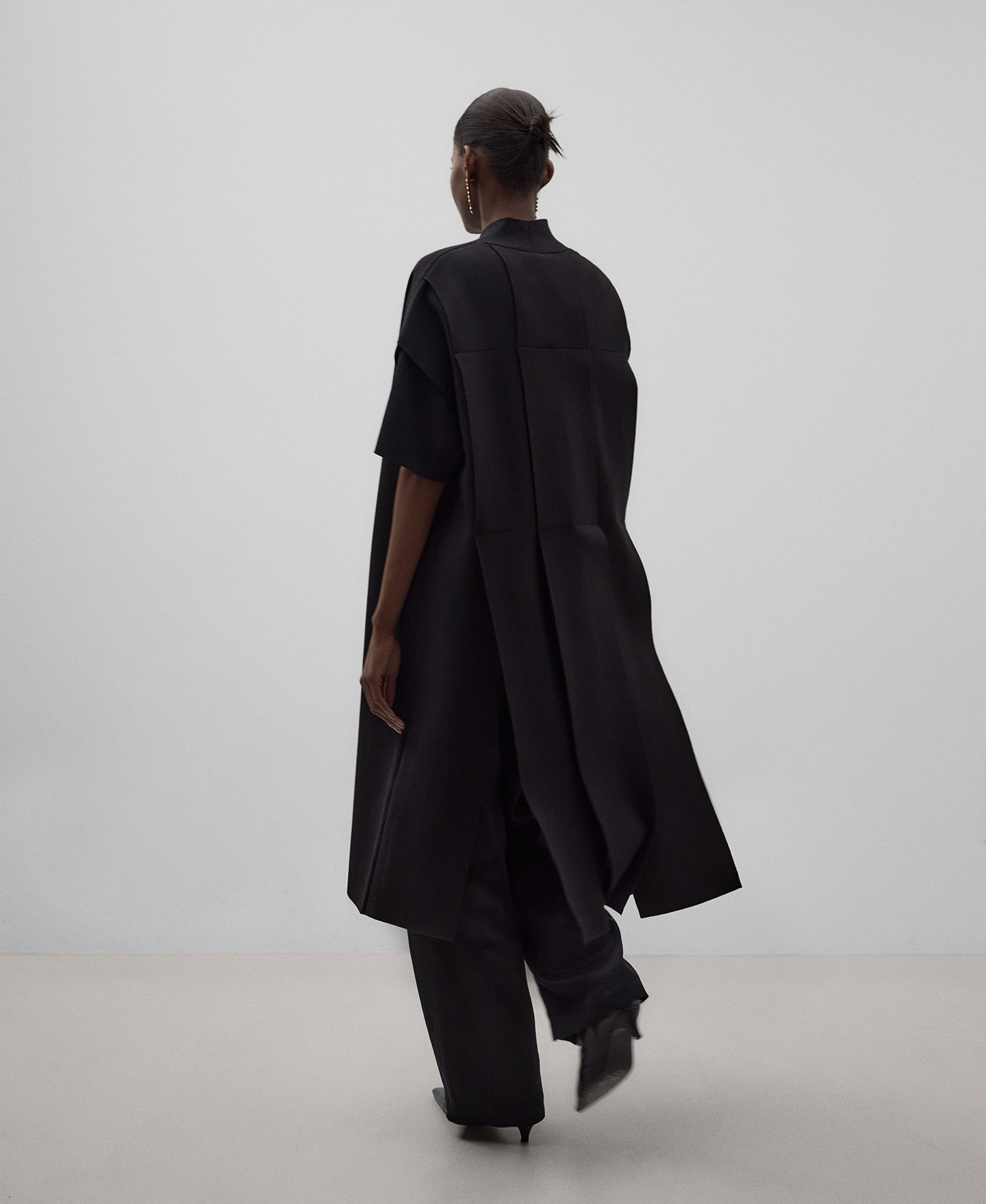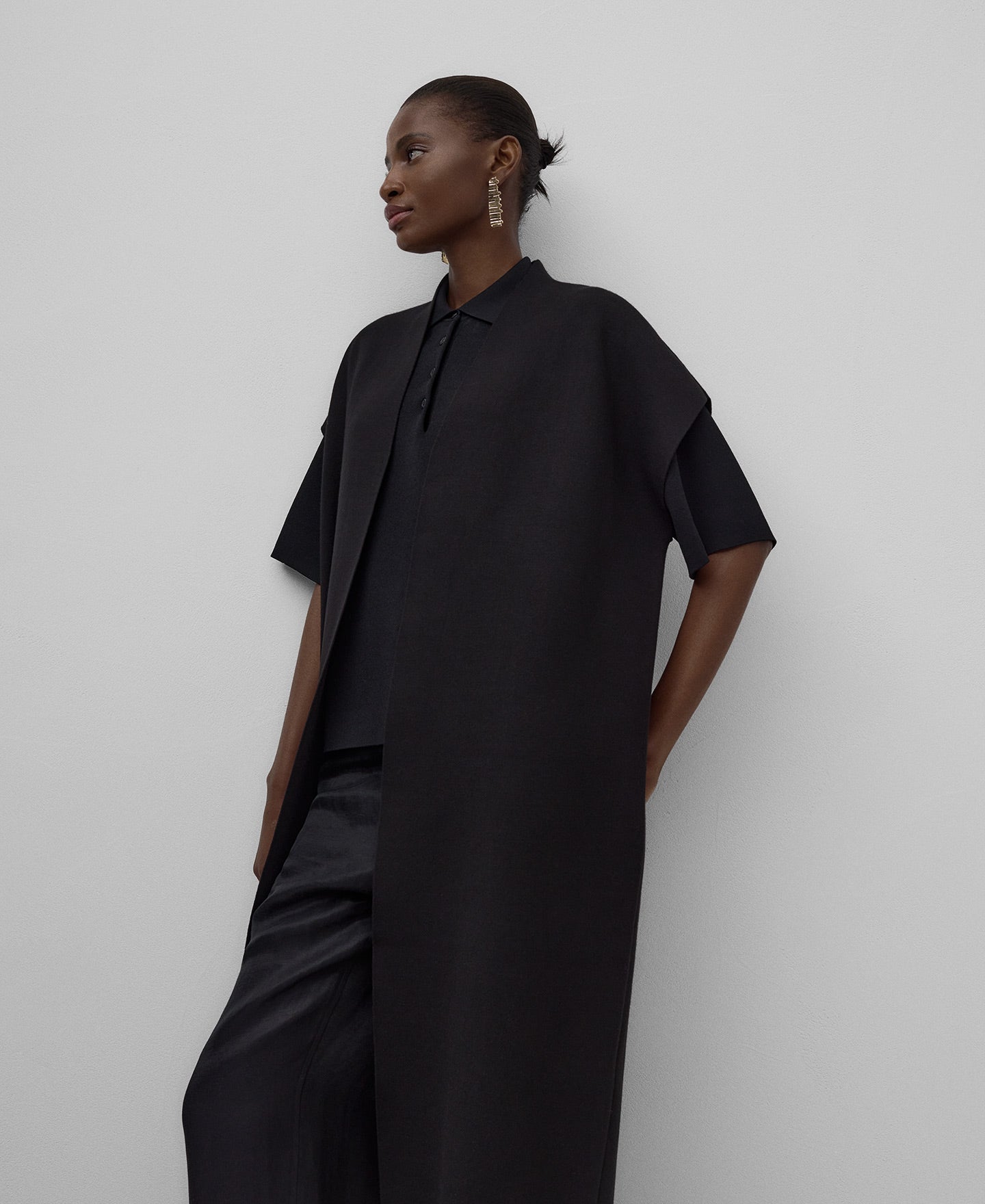 Black double-knit long vest woman. Cross-front. Back strap work.