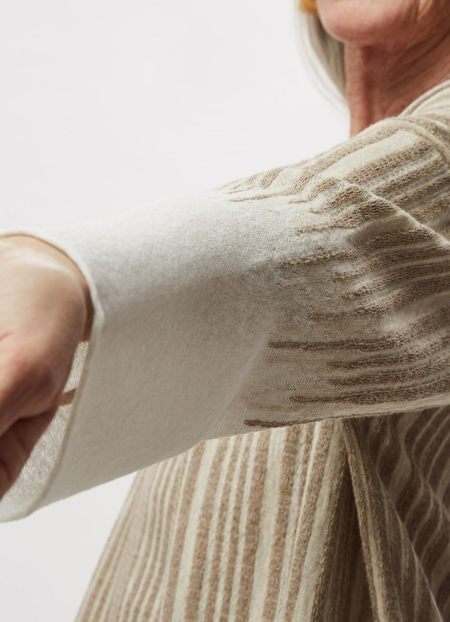 Knitted with bicolour linen and cotton yarns, this twin set features a fluid silhouette cardigan with open front and a pattern that takes inspiration from fields of wheat. We have added a touch of viscose for enhanced movement.