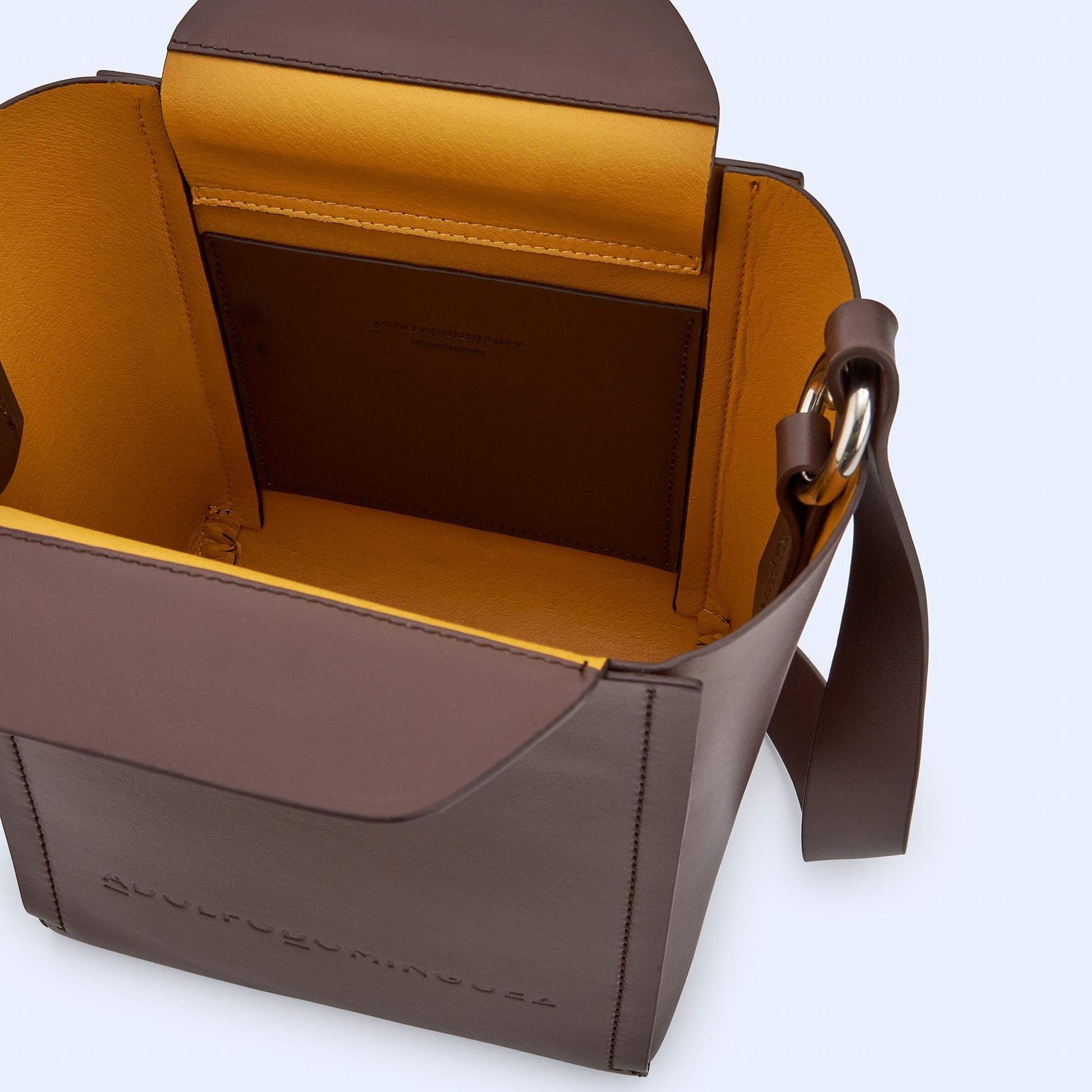 Made in Spain bucket bag. Bovine leather. Adjustable long handle. One compartment. Flap magnetic fastening. Inner pocket. Printed logo.