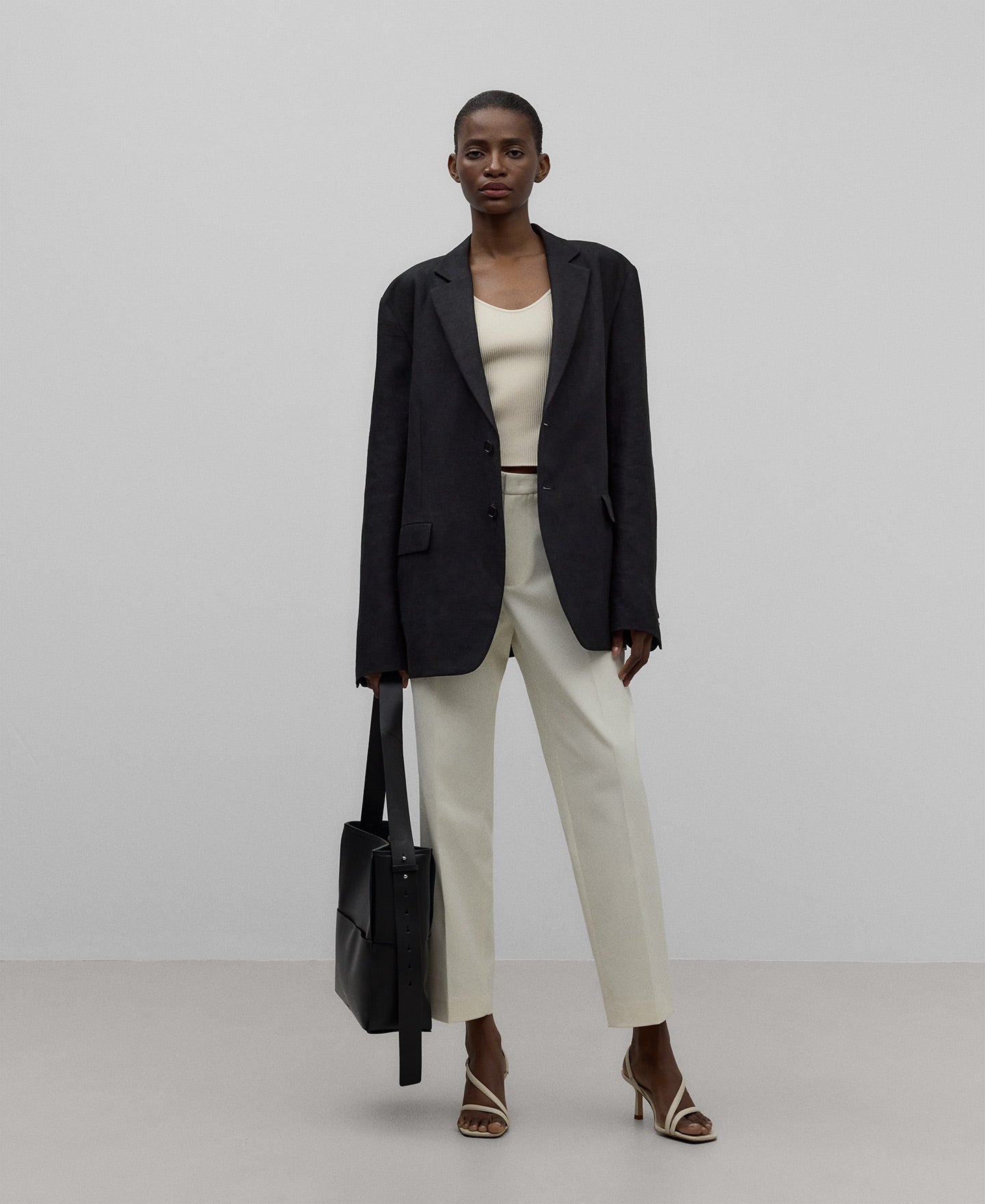 Ecru ankle-length trousers woman. Belt loops. Side pockets. Back welt pockets. Center crease in the front and back. Straight cut.